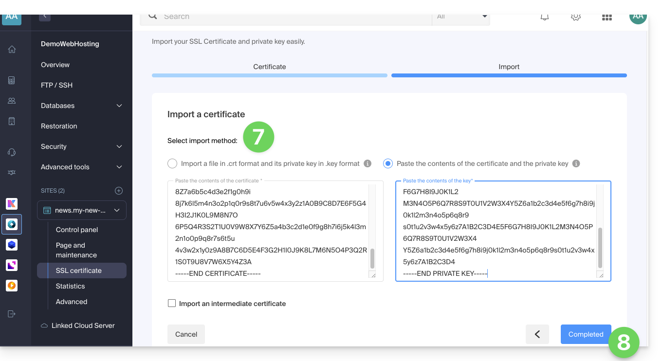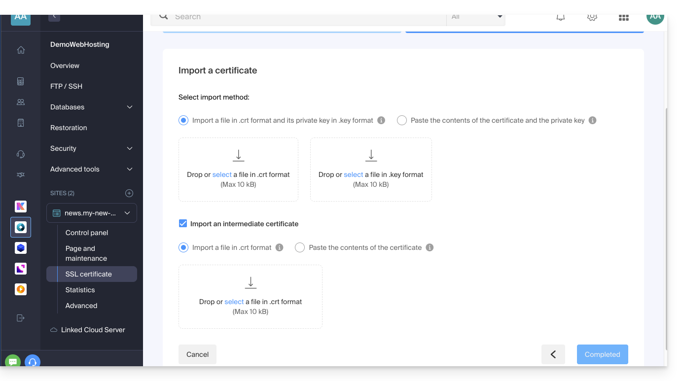 Lors de l'ajout d'un certificat SSL personnalisé, il est possible d'importer le certificat intermédiaire (par importation du fichier .crt ou copier-coller des données fournies par l'organisme de certification):