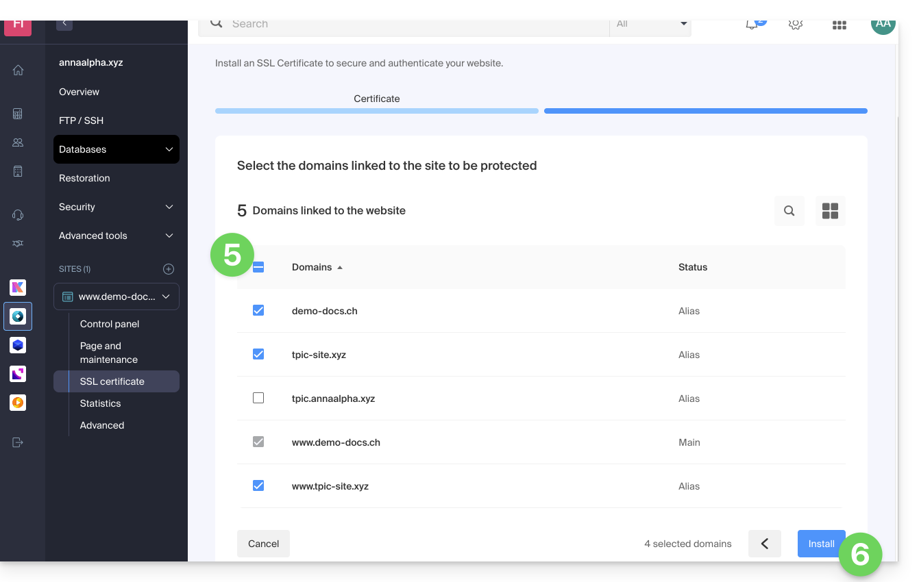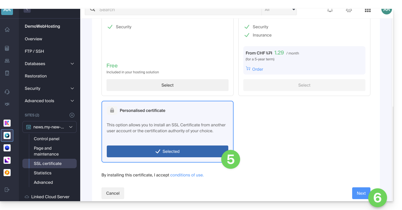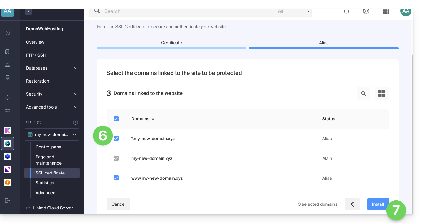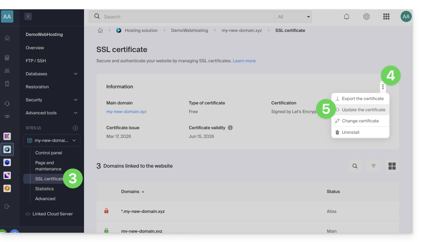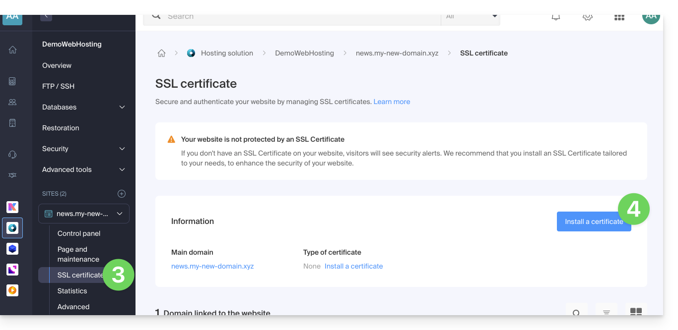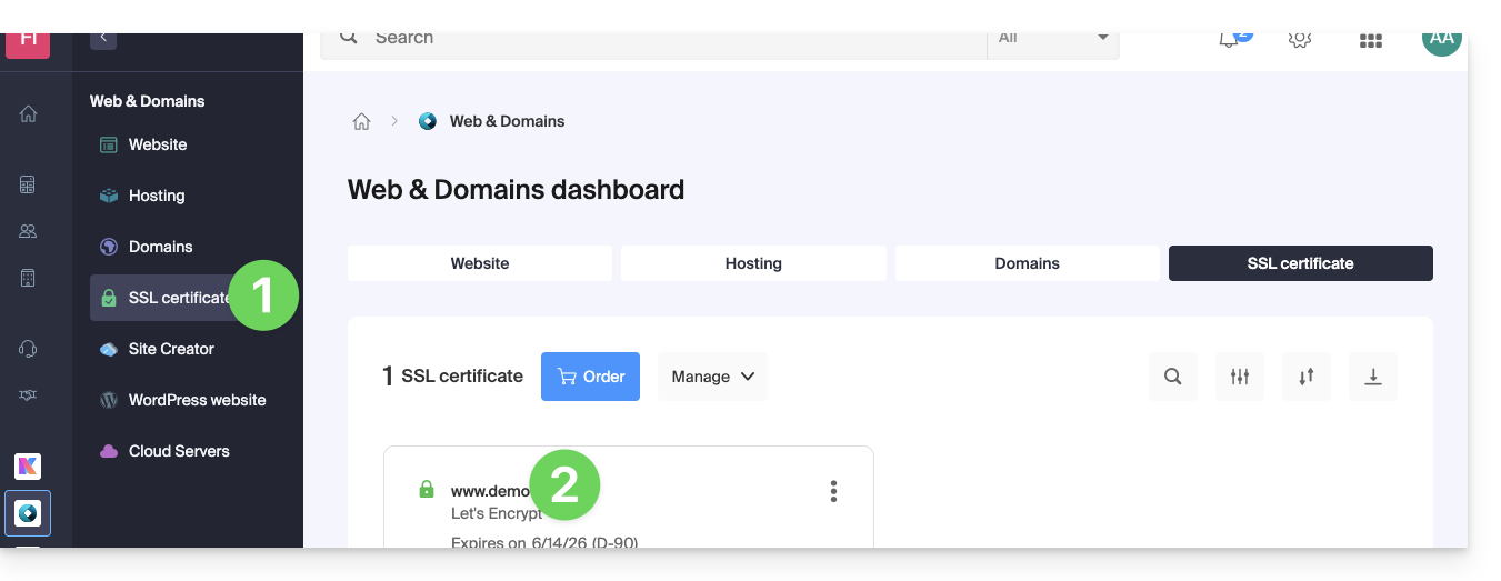 - Cliquez sur Certificat SSL dans le menu latéral gauche.