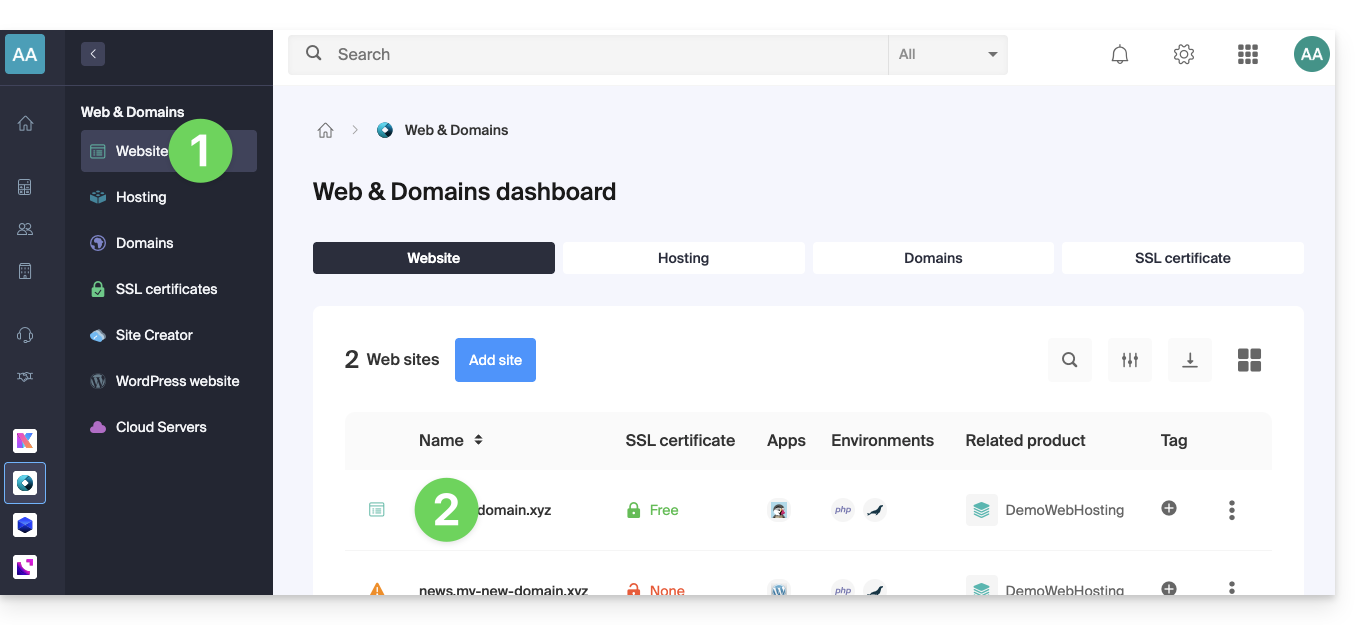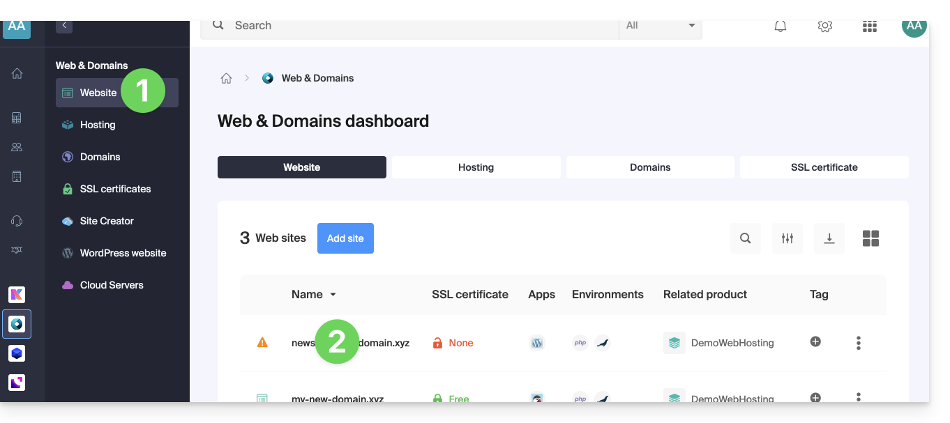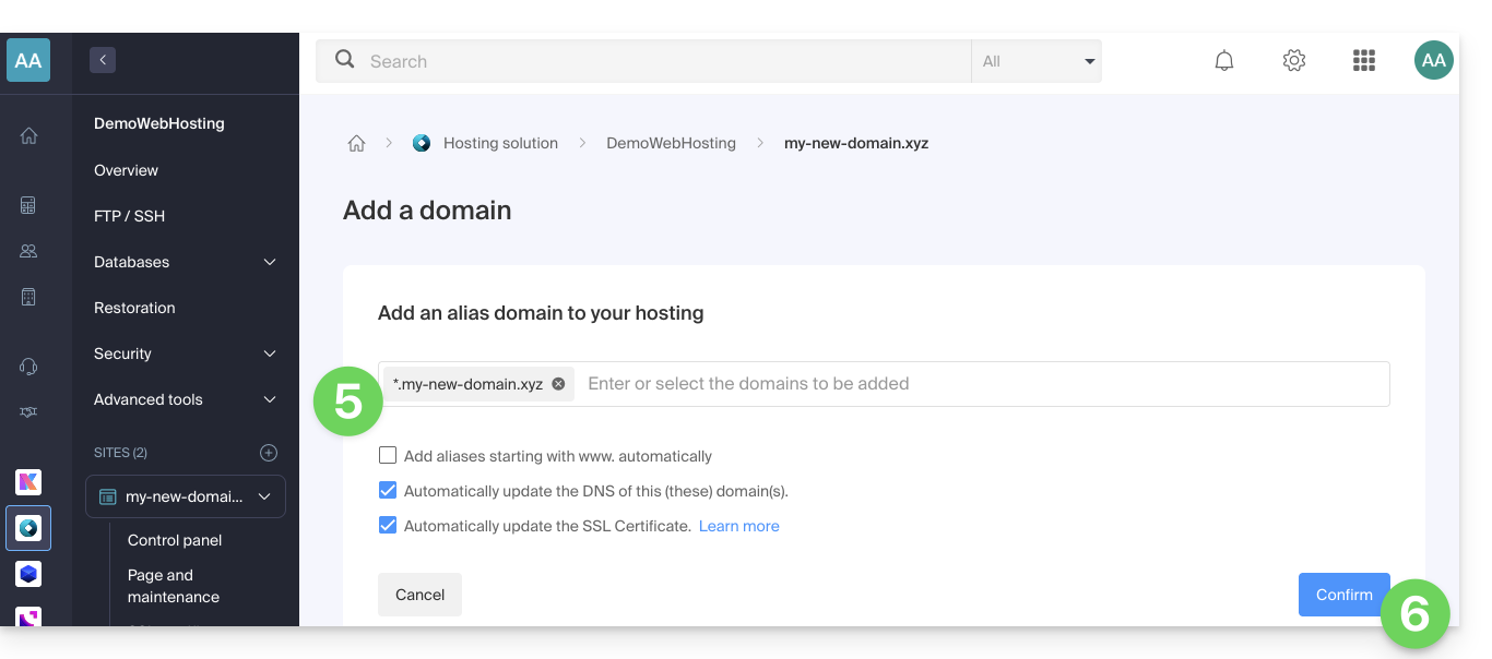 - Veillez à ce que le sous-domaine récemment ajouté soit bien sélectionné.