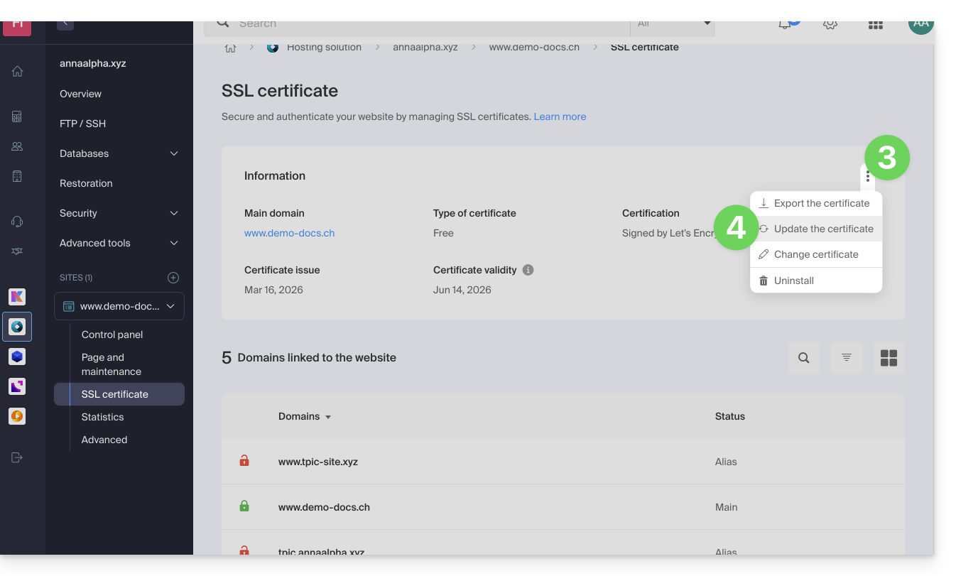 Ce guide explique comment mettre à jour un certificat SSL Let's Encrypt pour un site Web hébergé par Infomaniak.