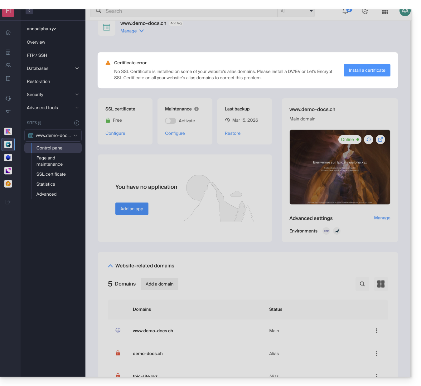 - Le tableau de bord vous indiquera clairement qu'un des domaines liés au site n'est pas englobé dans le certificat SSL en place: