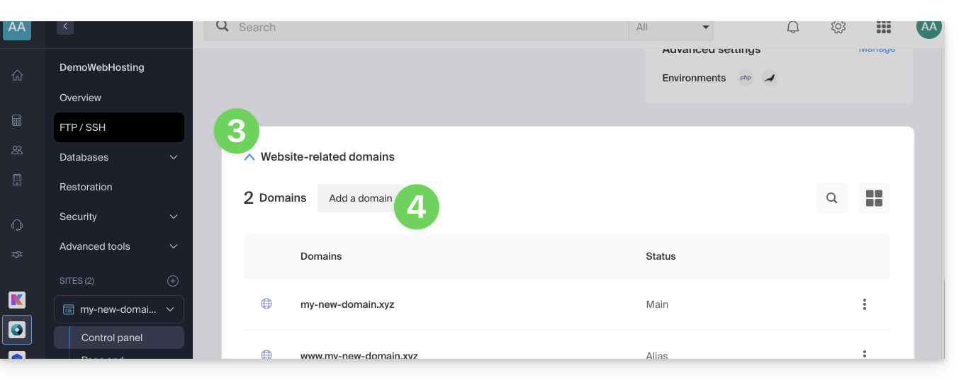 - Cliquez sur le bouton Ajouter un domaine: