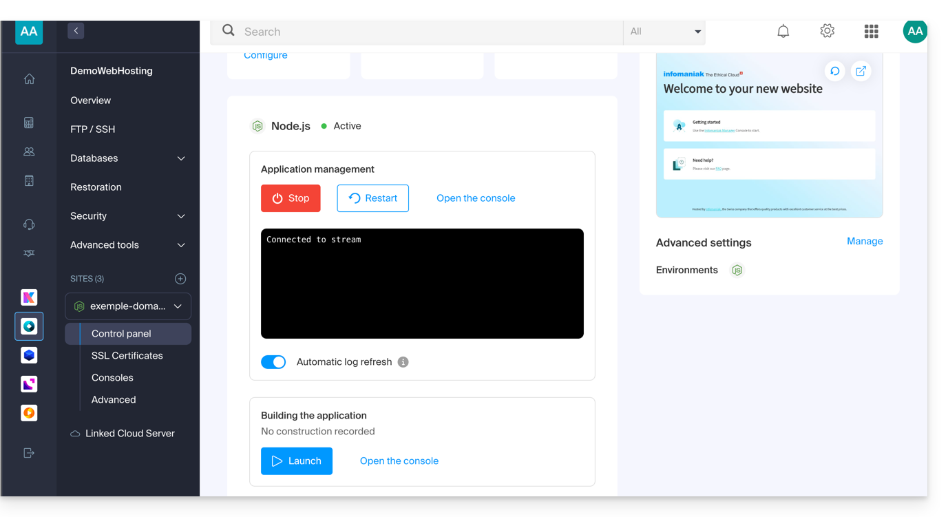 Chaque site dispose d'un tableau de bord dédié pour contrôler l'application (start, stop, restart), consulter la console d'exécution, gérer les versions de Node.js, configurer les domaines et activer les certificats SSL: