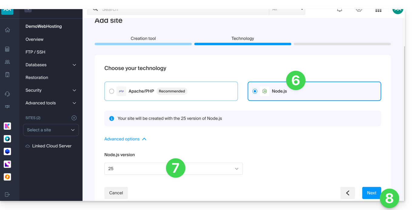 Pour accéder à un plan d'hébergement Web et y ajouter un site Node.js: