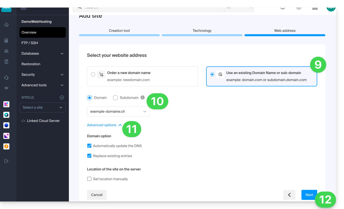 - Choisissez le type de domaine Ă attribuer Ă ce nouveau site :