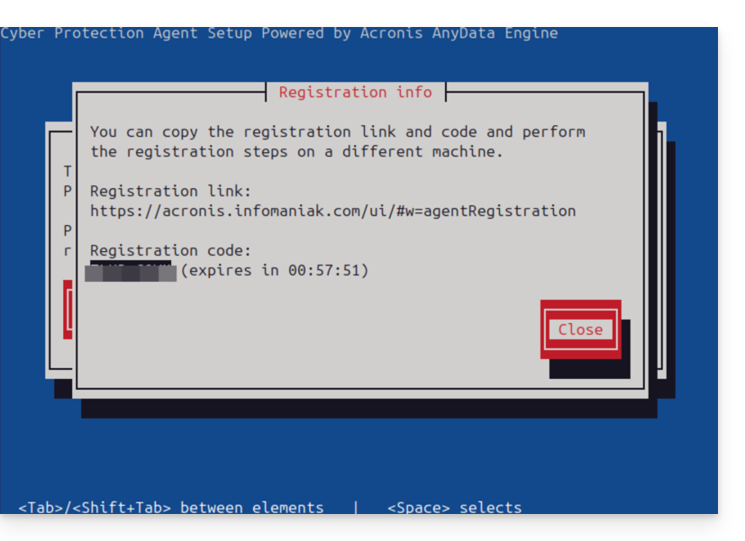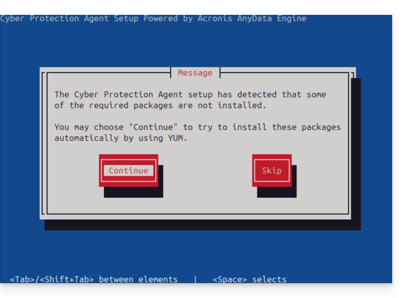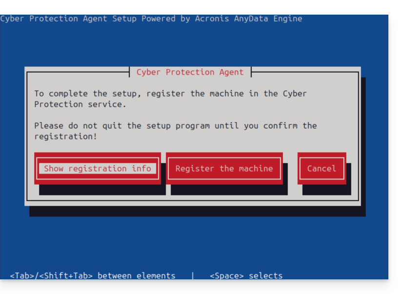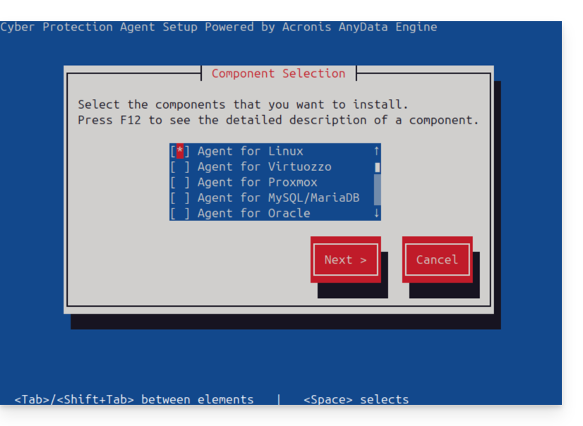 # Run the installation script ./CyberProtect_AgentForLinux_x86_64.bin- Utilisez la touche Tab pour naviguer et Entrée pour valider dans l'interface textuelle.