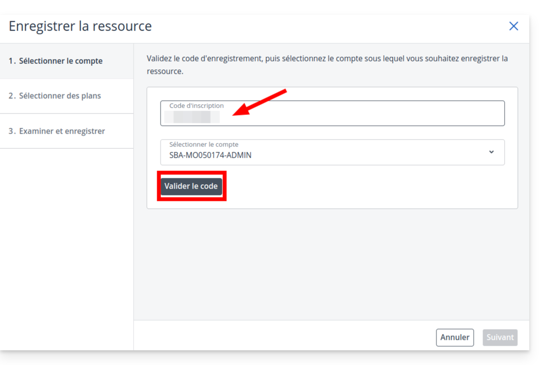 - Saisissez le code obtenu sur le serveur et cliquez sur Valider.