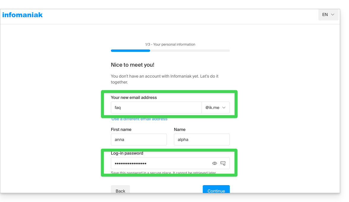 mail@domain.xyz- Une fois ces informations collées dans le champ dédié à cet effet, cliquez sur le bouton bleu Continuer: