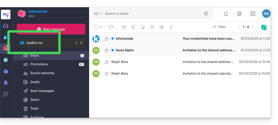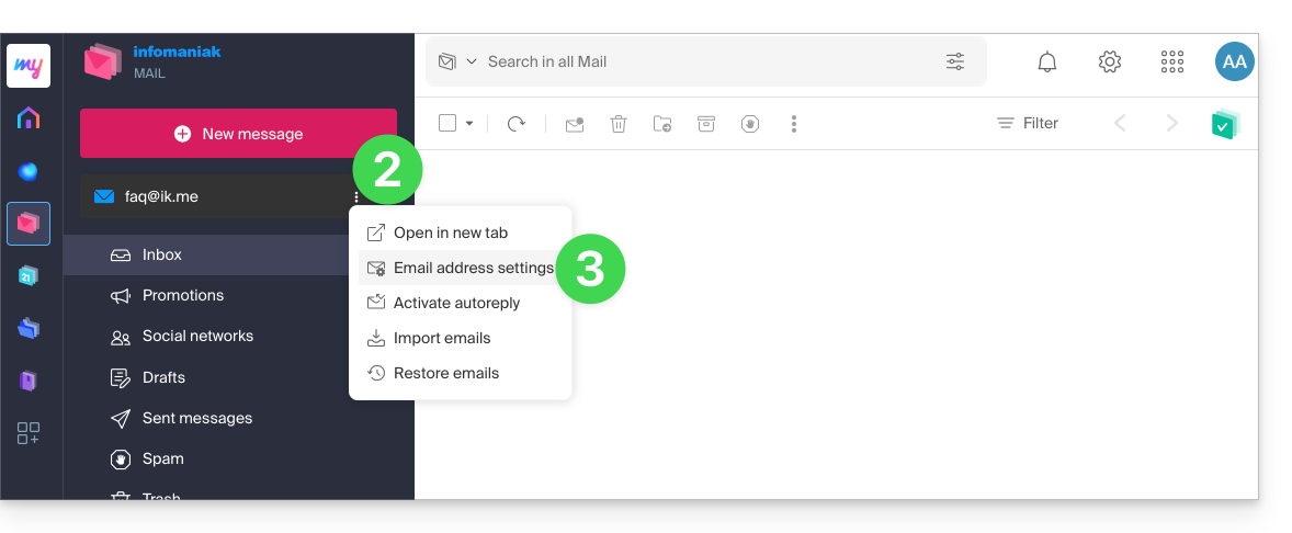 - Cliquez ici afin d'accéder à la gestion de votre Service Mail sur le Manager Infomaniak (besoin d'aide ?).
