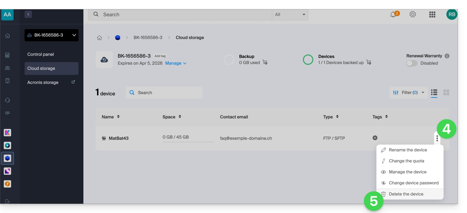 La suppression de l'appareil est irréversible et l'ensemble des données sauvegardées seront supprimées des serveurs Infomaniak sans possibilité d'obtenir une restauration.