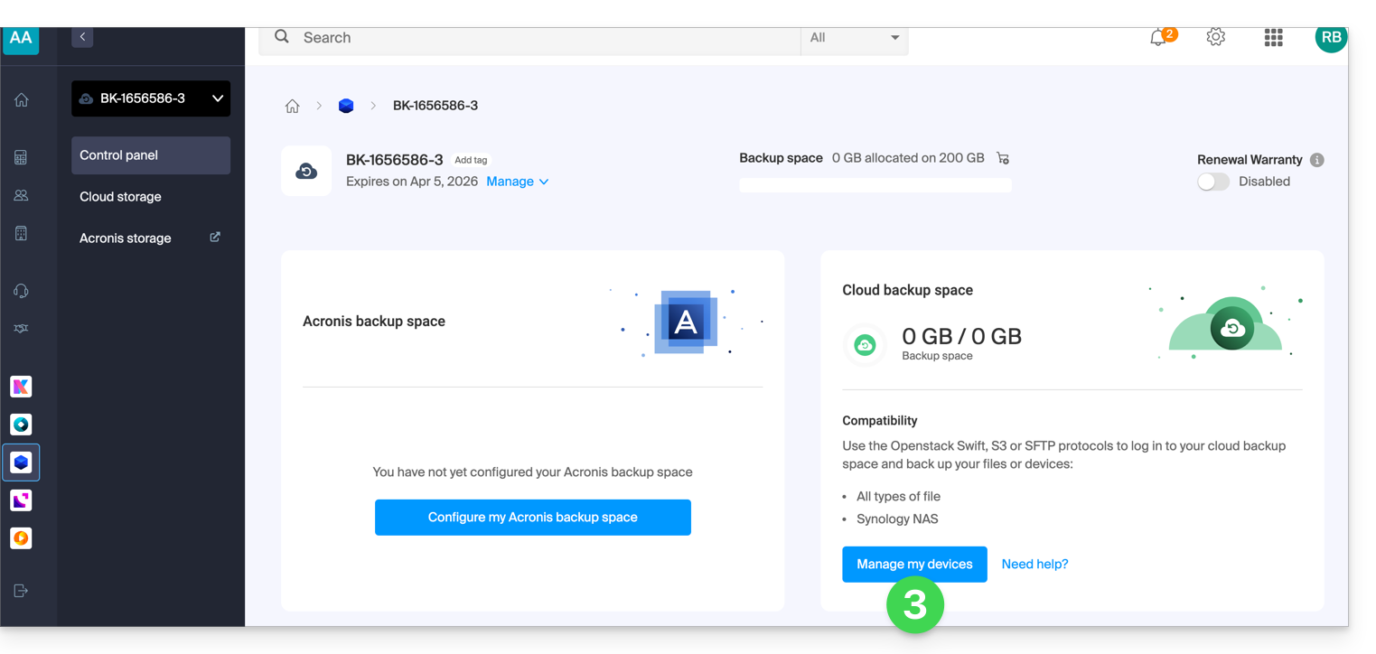 - Cliquez sur le bouton bleu Gérer mes appareils (dans la partie Espace de sauvegarde Cloud):