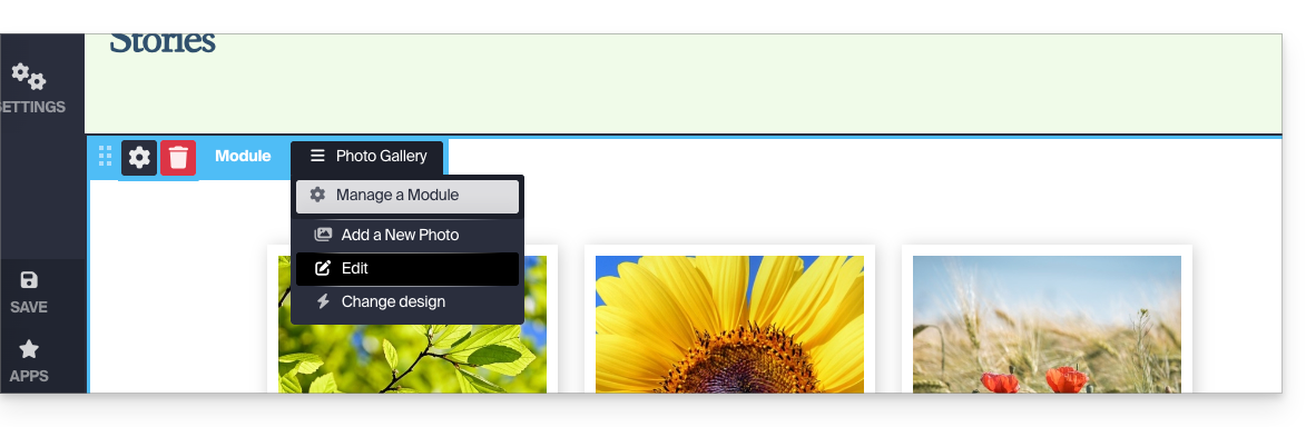 - Survolez le module pour accéder aux paramètres de la galerie.