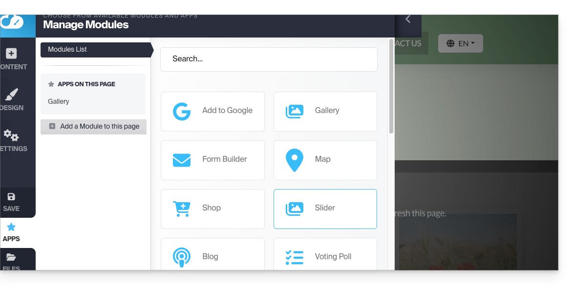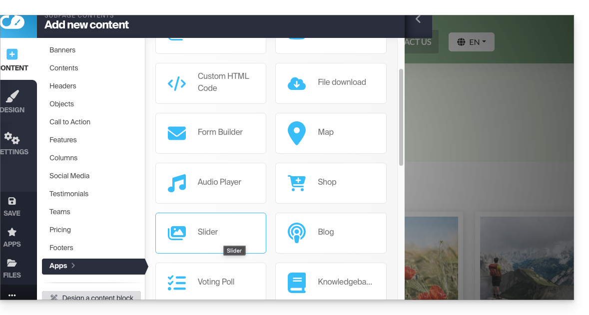 - Insérez le widget configuré à l'endroit désiré en cliquant sur Contenu puis Apps et choisissez Slider: