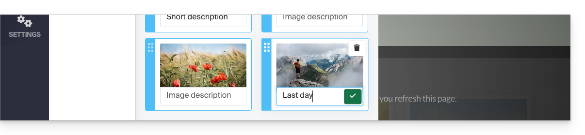 De plus, vous pouvez ajouter une description à n'importe laquelle de vos photos, sous chaque image, vous remarquerez le champ "Description de l'image", commencez à y taper votre description et appuyez sur le bouton vert pour enregistrer les modifications: