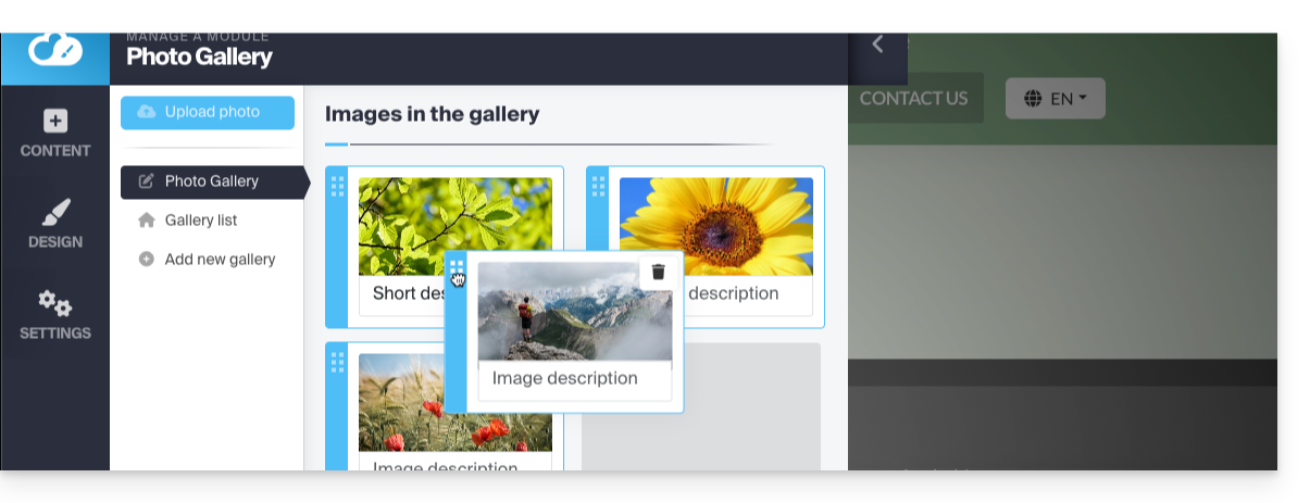Lorsque votre galerie est créée, chaque nouvelle photo que vous téléchargez depuis votre ordinateur est ajoutée à la fin de la liste des photos ; vous pouvez facilement modifier cet ordre en glissant les photos avec la souris quand vous éditez une galerie: