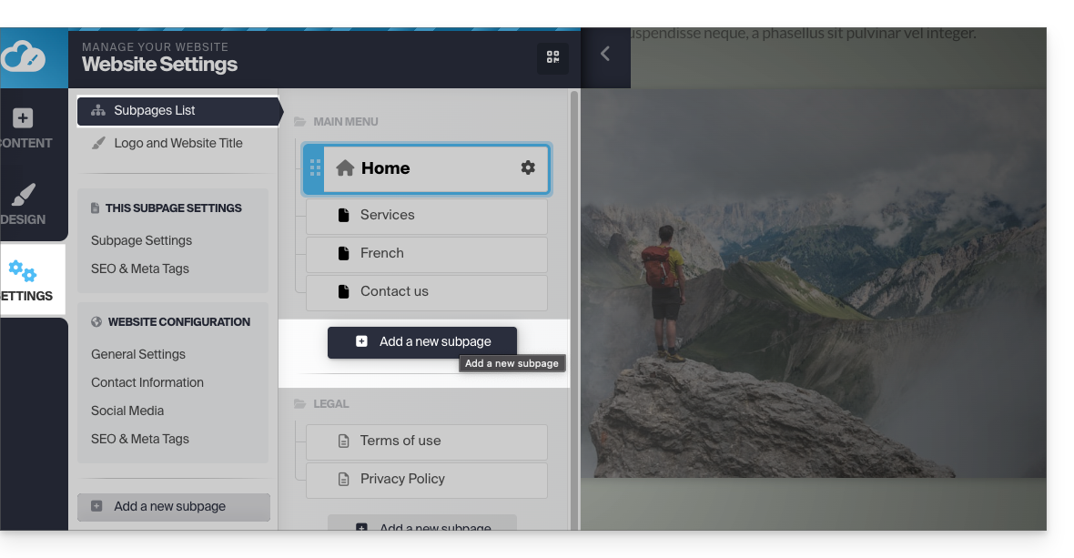 - Cliquez sur le bouton Réglages dans le menu latéral gauche, la liste de vos pages apparaît.