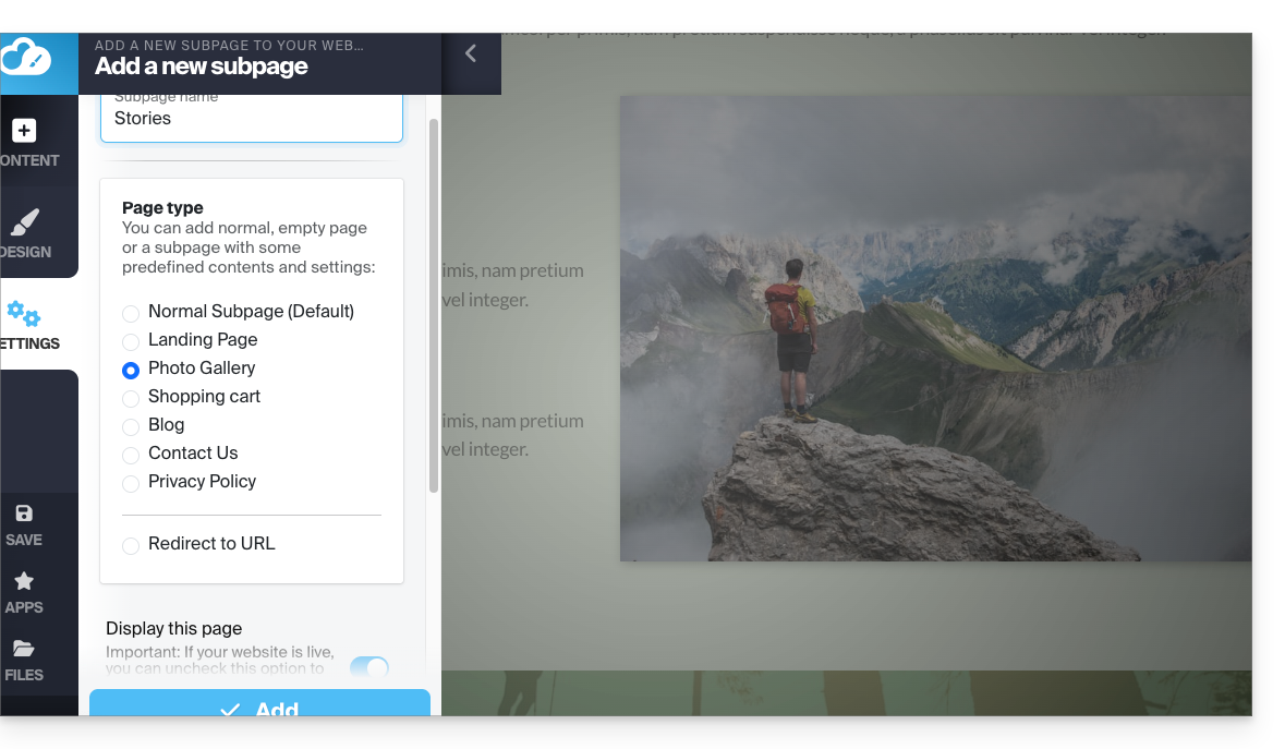 - Activez Afficher plus d'options pour choisir le type de page GALERIE PHOTO: