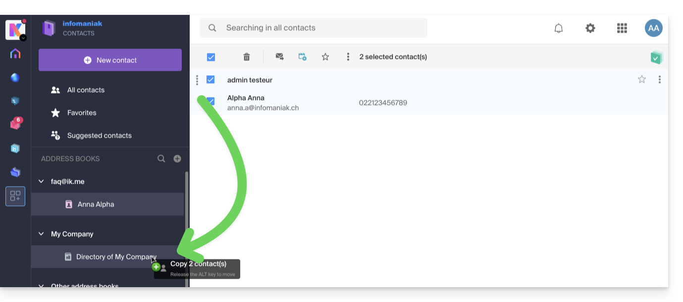 Questa guida spiega come copiare o spostare i contatti nei cartelle degli indirizzi dell'app Web Contatti Infomaniak (servizio online ksuite.infomaniak.com/contacts).