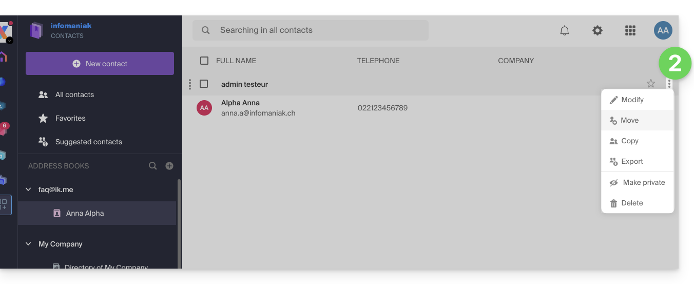 Copiare o spostare i contatti sull'app Web Contatti Infomaniak