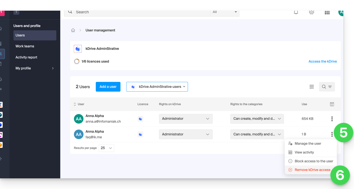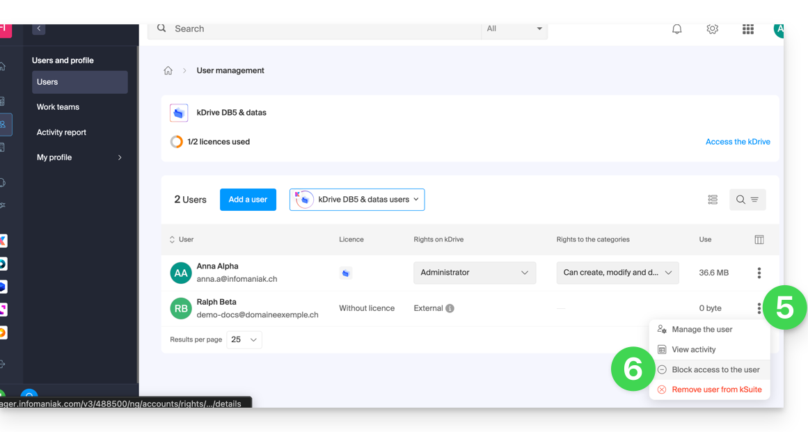 Questa guida spiega come aggiungere, bloccare, sostituire o eliminare un utente da un kDrive. Per ulteriori informazioni sulla gestione dei diritti degli utenti, consultare questa altra guida.