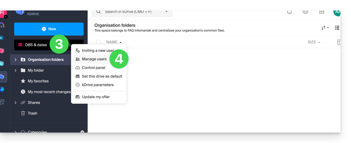- Verifica o seleziona il kDrive interessato nel menu a discesa del menu laterale sinistro.