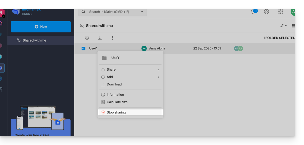 Nota che l'utente esterno può anche, dal suo kDrive limitato, ritirarsi da solo interrompendo l'accesso al file condiviso se non desidera più accedere a quel file:
