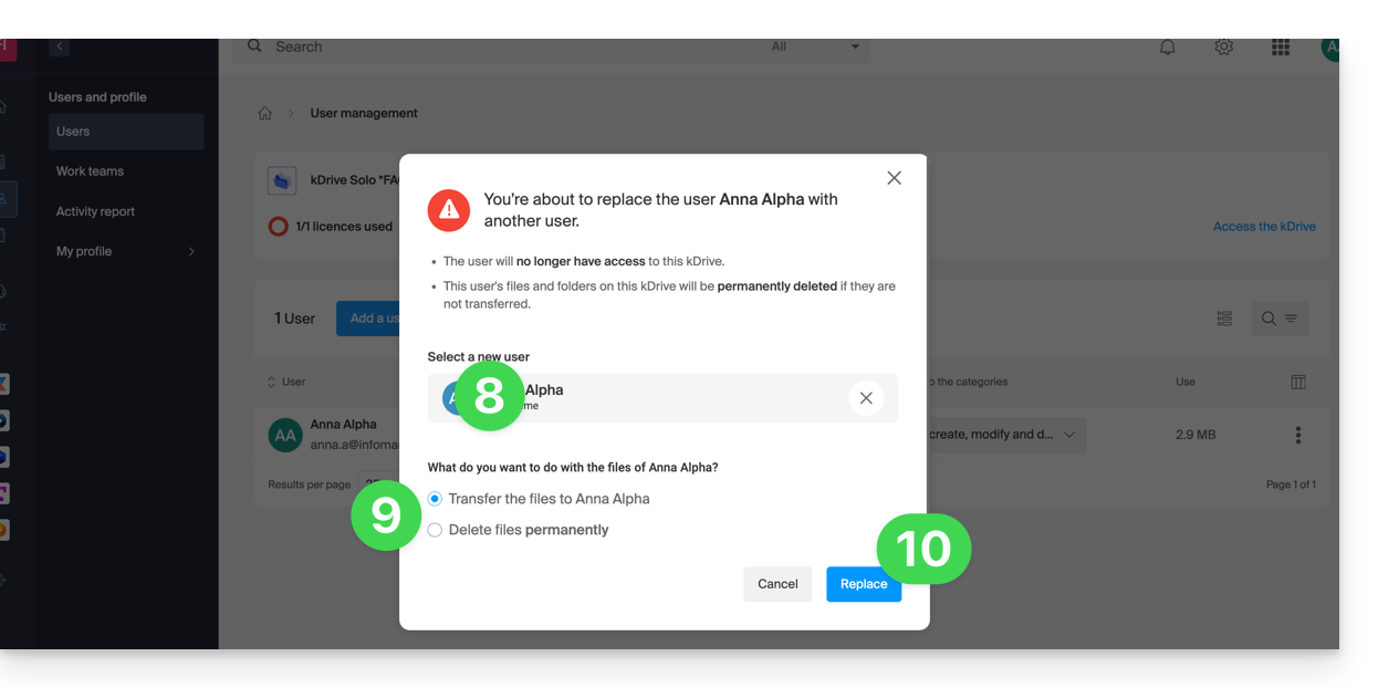 - Scegli se i dati esistenti su kDrive devono essere conservati e trasferiti all'utente, o se devono essere eliminati completamente e definitivamente.