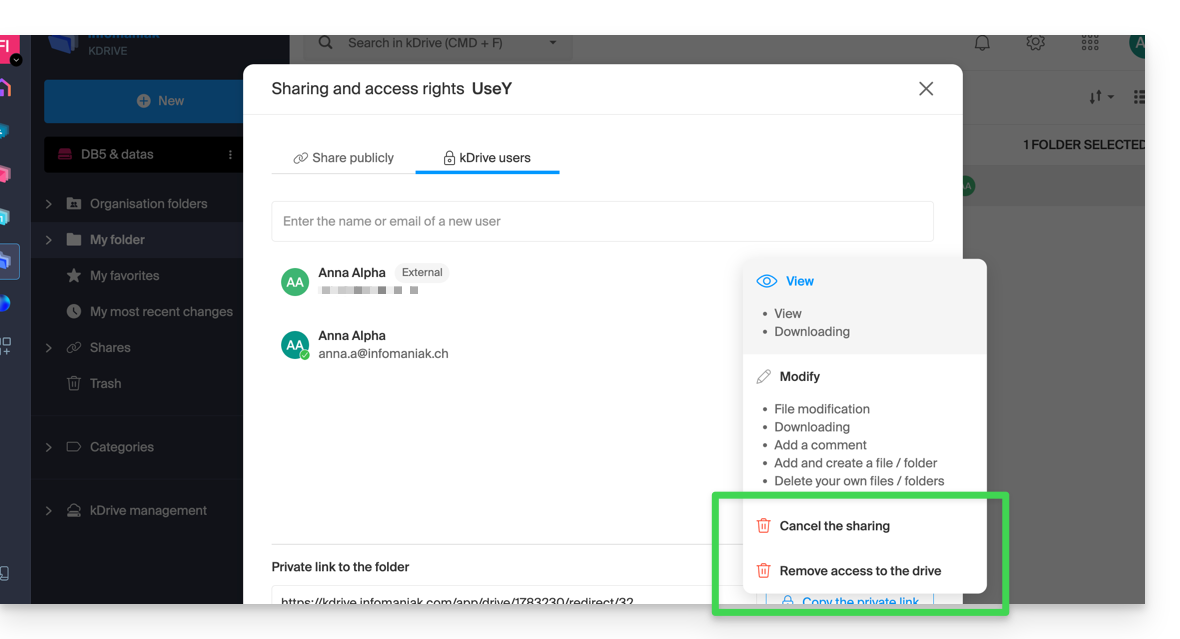 - rimuovere il suo accesso a tutti i file che gli hai condiviso da questo kDrive