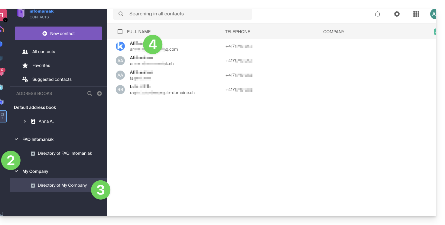 - Clicca qui per accedere all'app Web Contatti Infomaniak (servizio online ksuite.infomaniak.com/contacts).