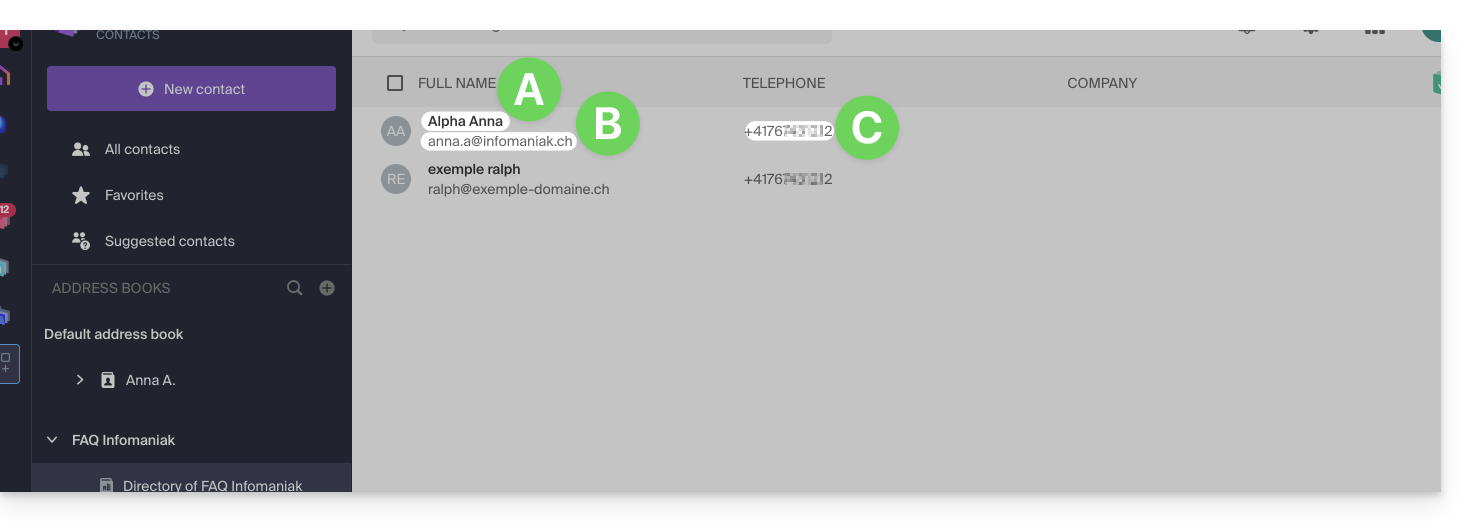 Per modificare il nome e cognome visibili nel directory, l'utente interessato (qui anna.a@infomaniak.ch) deve accedere al proprio account e modificare le proprie coordinate. Prendi visione di questa altra guida a riguardo.