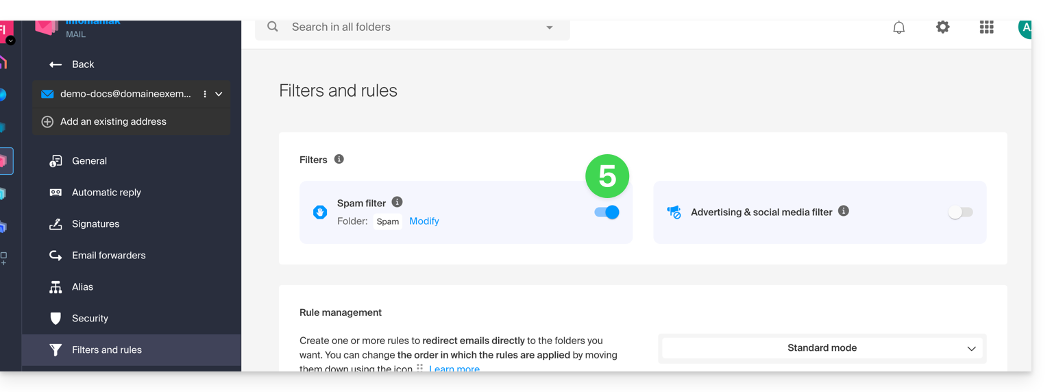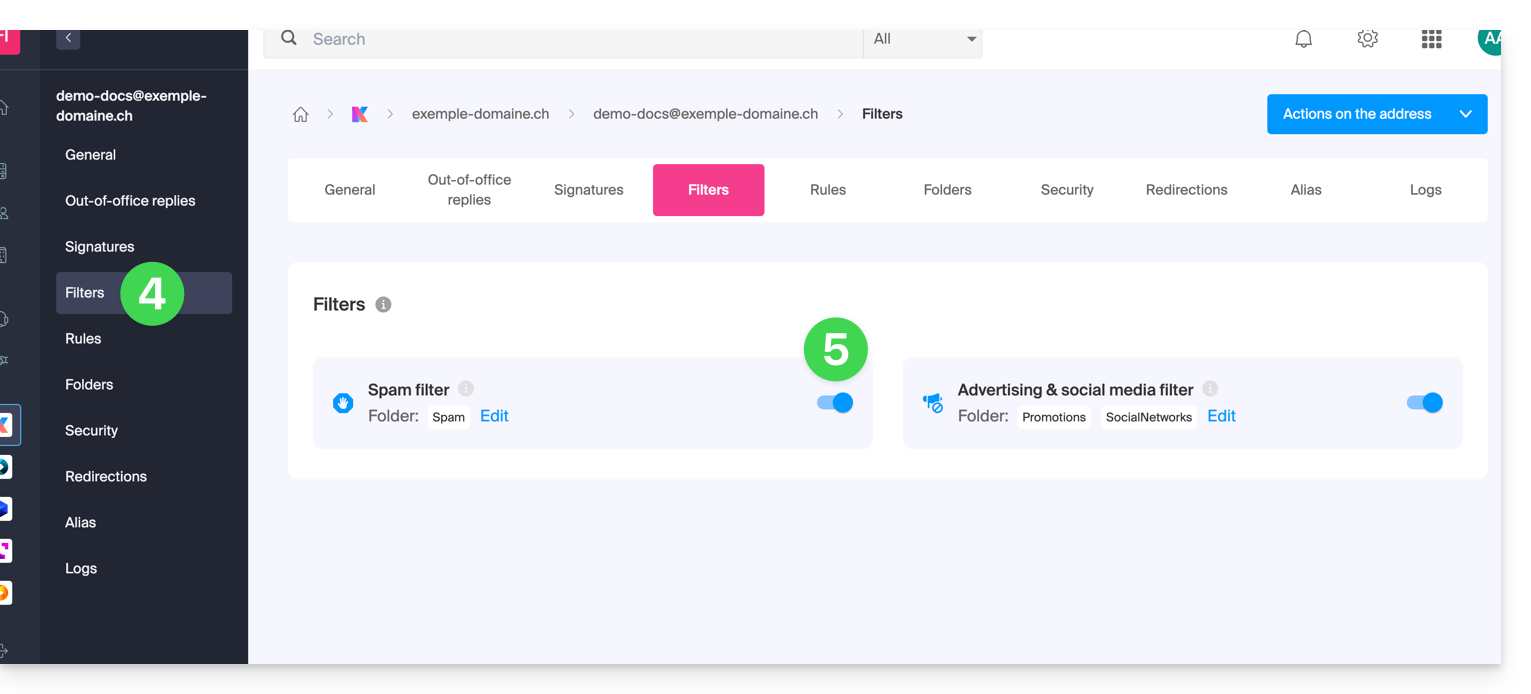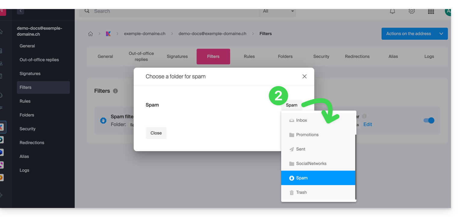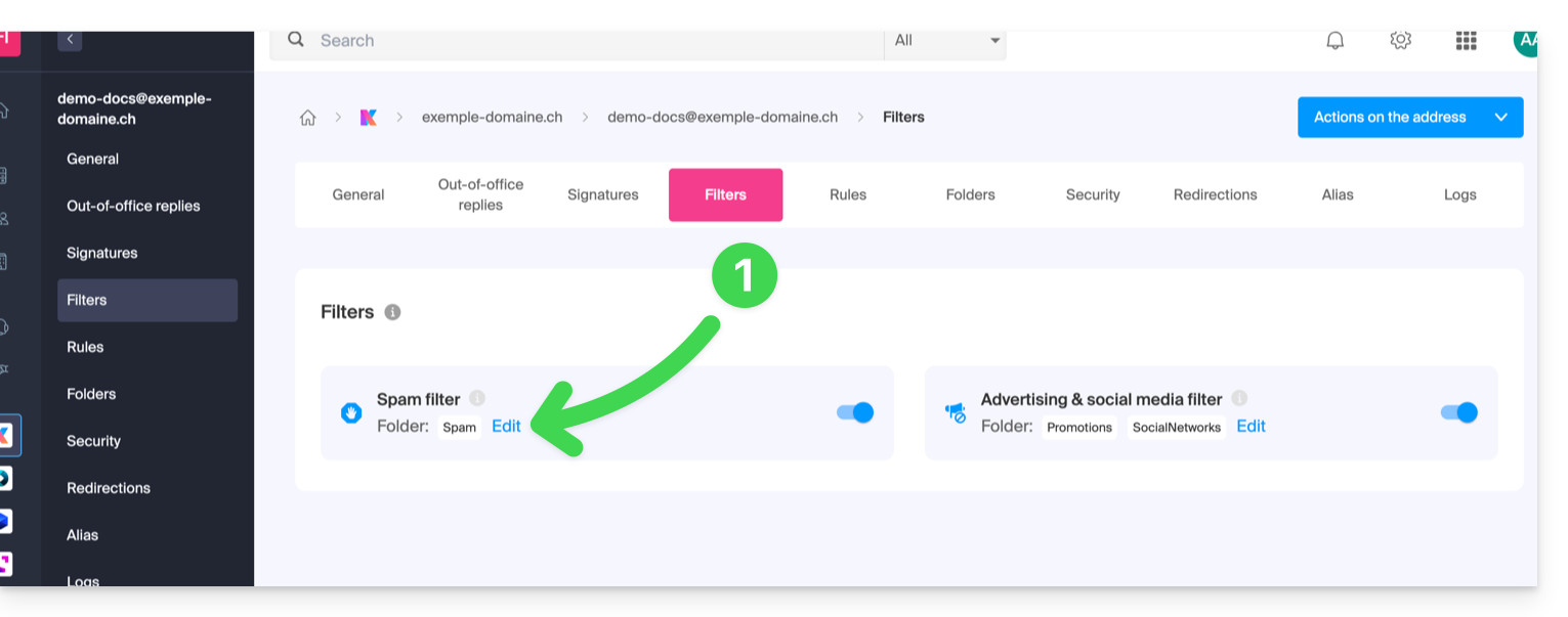 Spam(o nella cartella di destinazione dello spam - leggere di seguito) e poi automaticamente eliminati dopo 30 giorni. - Inoltre, il filtro è attivato automaticamente durante la creazione di un indirizzo email all'interno di un Servizio Mail Infomaniak o durante la sottoscrizione a un'offerta my kSuite / my kSuite+.