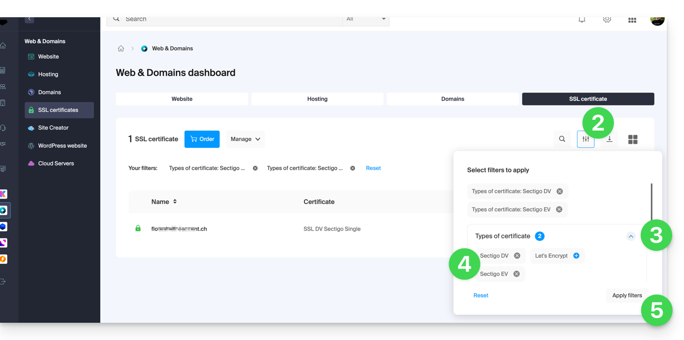 - Visualizza i diversi tipi di certificati come Let's Encrypt, Sectigo DV & EV...