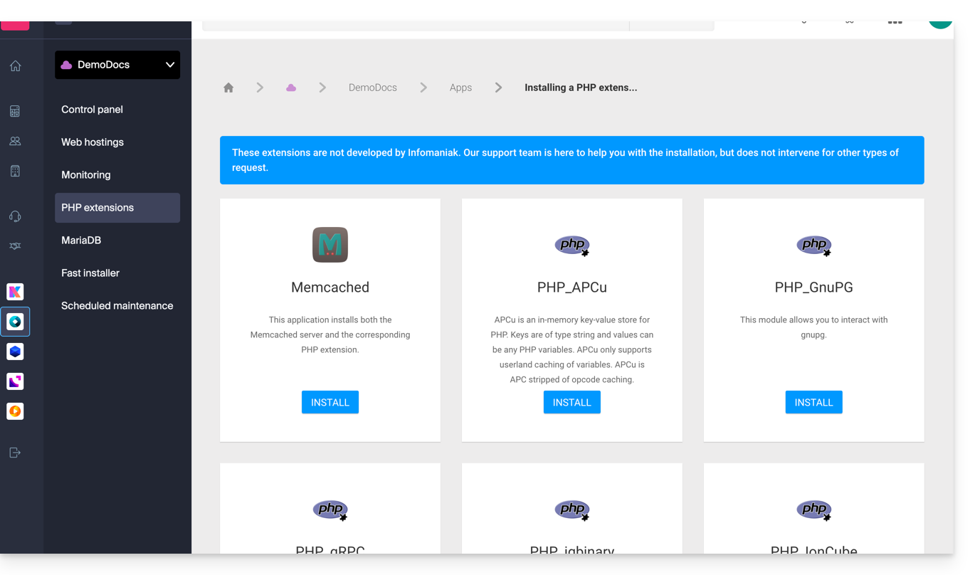 Questa guida spiega come installare applicazioni, estensioni PHP e tecnologie (lista non esaustiva riportata di seguito) in pochi clic su Serveur Cloud esclusivamente.
