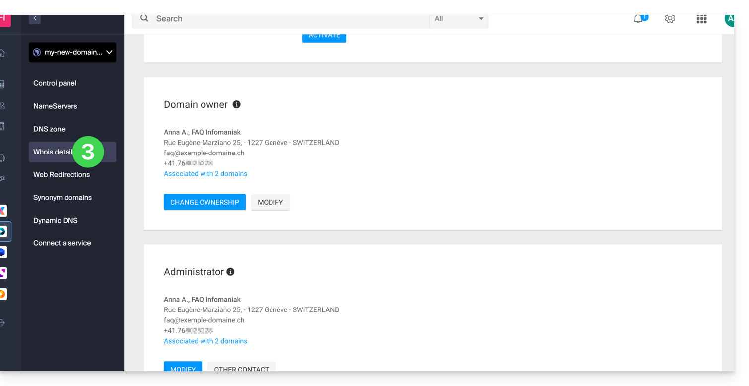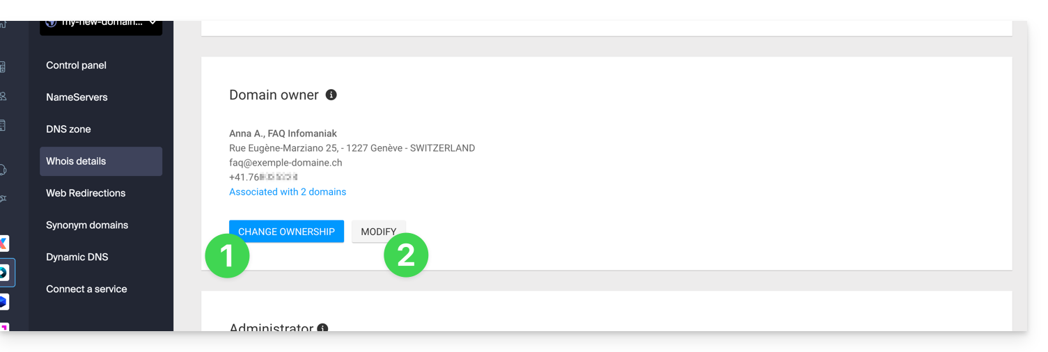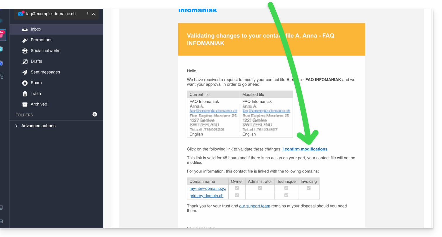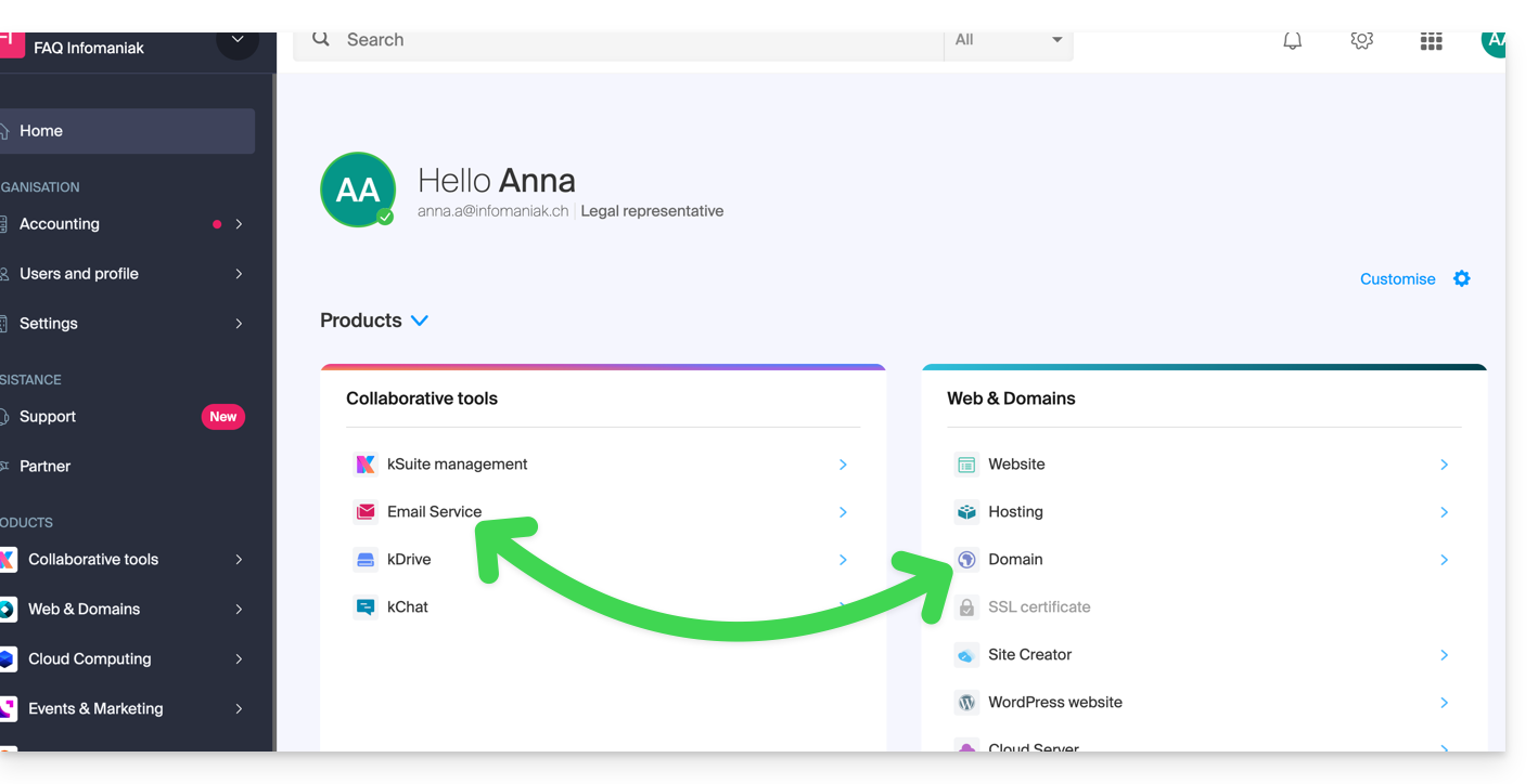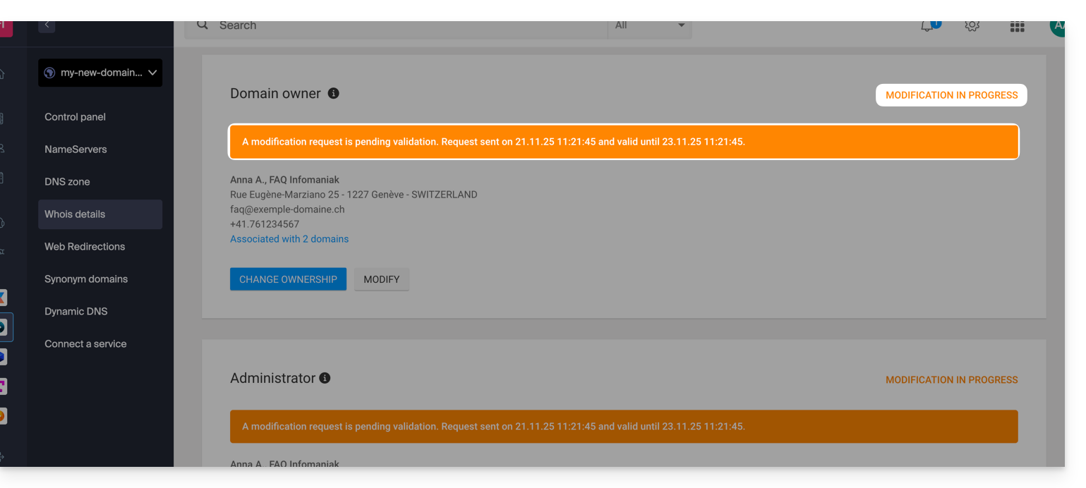 Se il tuo nome di dominio è registrato presso Infomaniak e si trova nello stesso account utente o Organizzazione della posta elettronica, allora non c'è nulla da fare.
