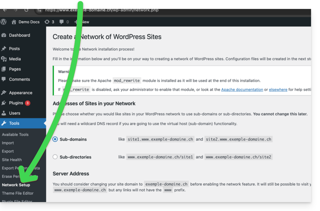 Questa guida spiega come configurare una rete di siti WordPress per gestire più siti da una singola installazione di WordPress Infomaniak, con indirizzi URL come site1.domain.xyz, site2.domain.xyz, o anche con domain1.com, domain2.com, ecc.
