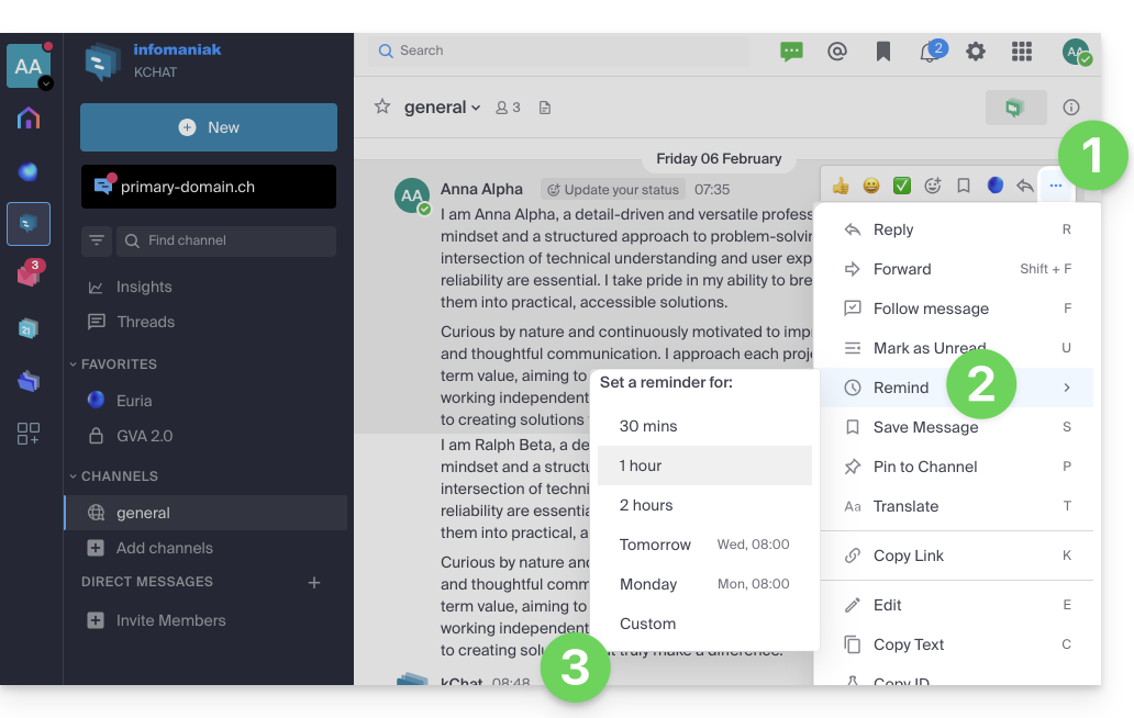- Dall'app Web kChat (servizio online ksuite.infomaniak.com/kchat), clicca sul menu di azione ⋮ a destra del canale interessato (nella barra laterale sinistra).