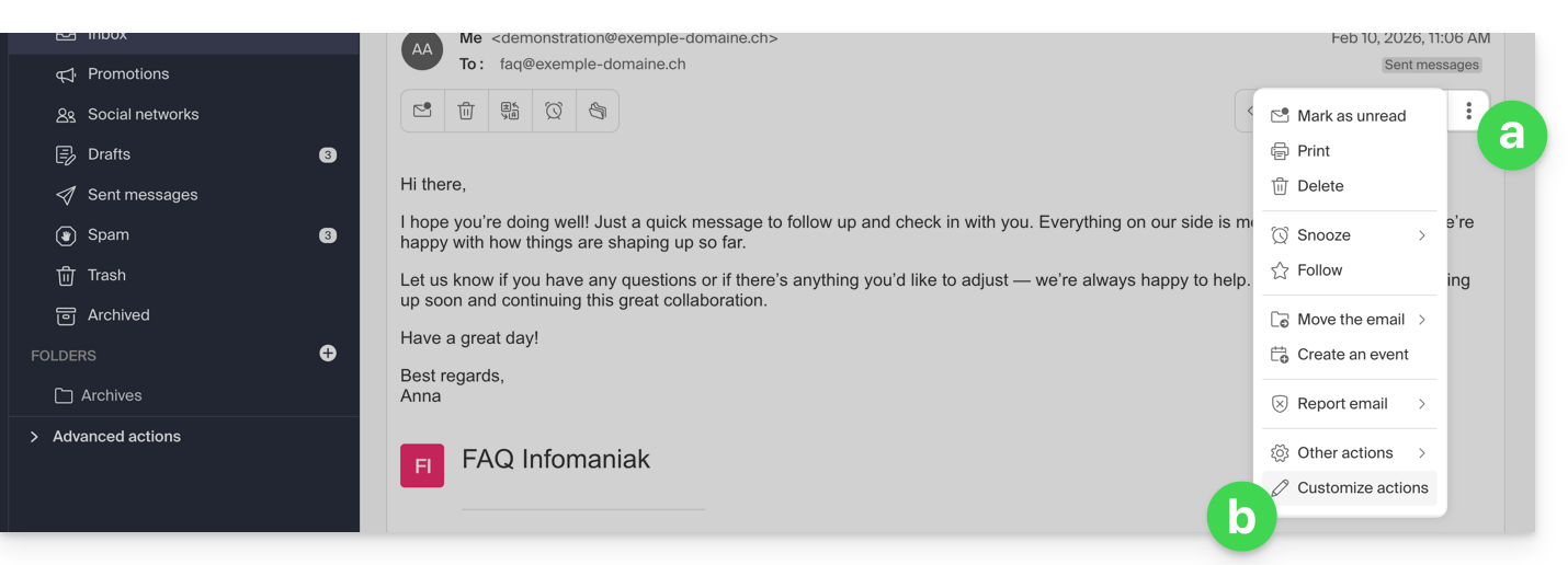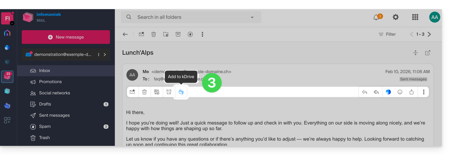 Questa guida spiega come salvare gli allegati (PJ) di un'e-mail dall'app Web Mail Infomaniak (servizio online ksuite.infomaniak.com/mail). Potrete così salvare in 1 clic l'intero set di file allegati a un messaggio, in un archivio .zip sul vostro computer, o all'interno del vostro kDrive ecc.