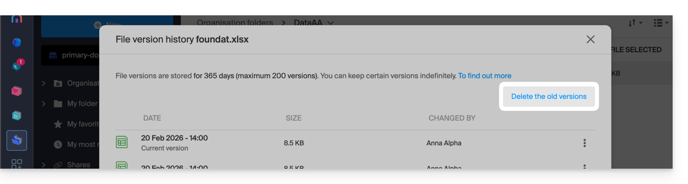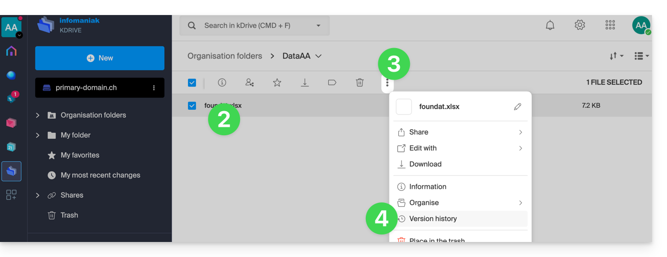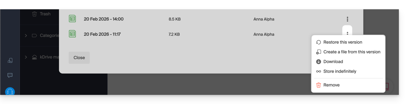 - kDrive offre un registro di accesso ai dati e una cronologia delle azioni può essere consultata direttamente dal Manager; è possibile accedere a un rapporto di attività per monitorare la cronologia delle azioni degli utenti di tutto il tuo kDrive; puoi anche tenere traccia dei tuoi dati e delle modifiche apportate a ogni documento, foglio di calcolo o presentazione.