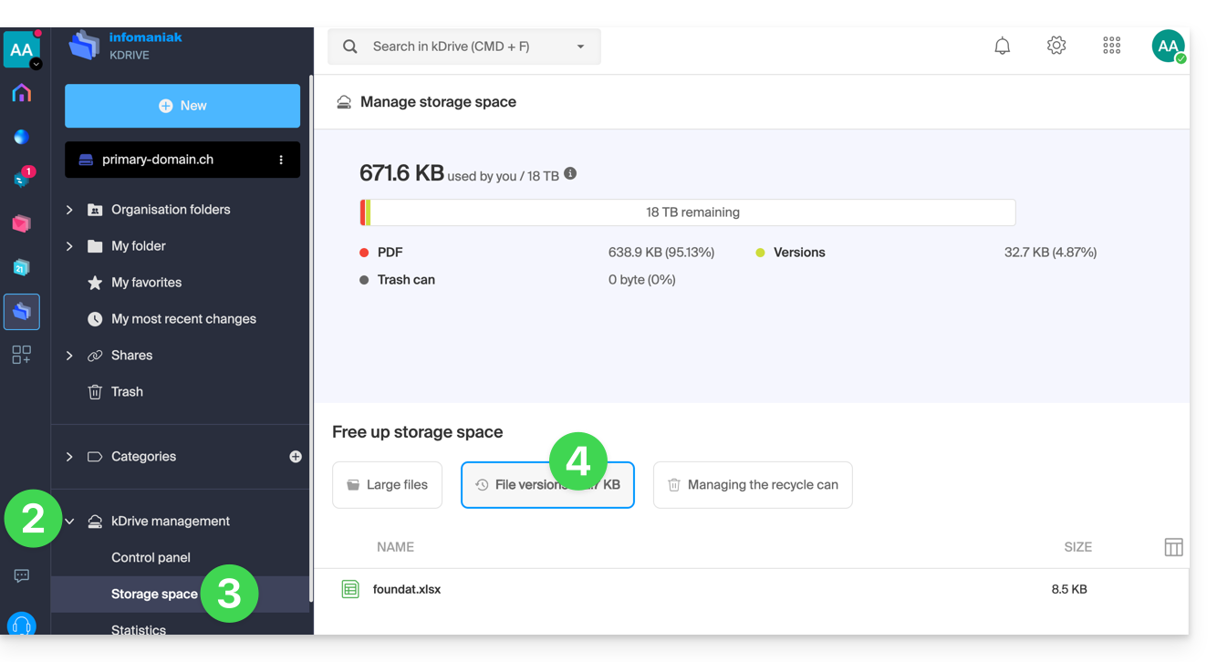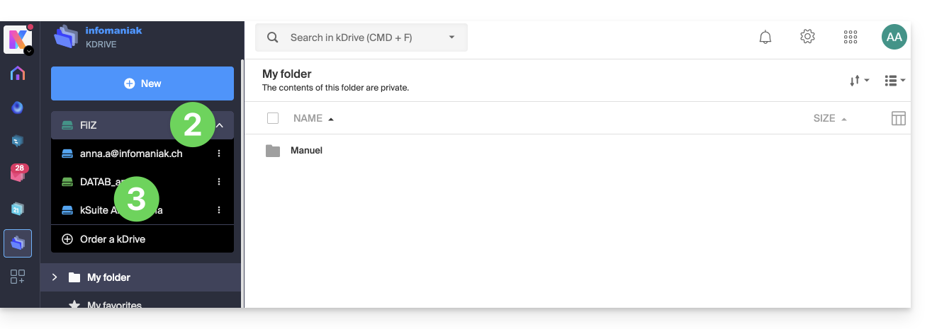 - La struttura del kDrive si visualizza nel menu laterale sinistro.