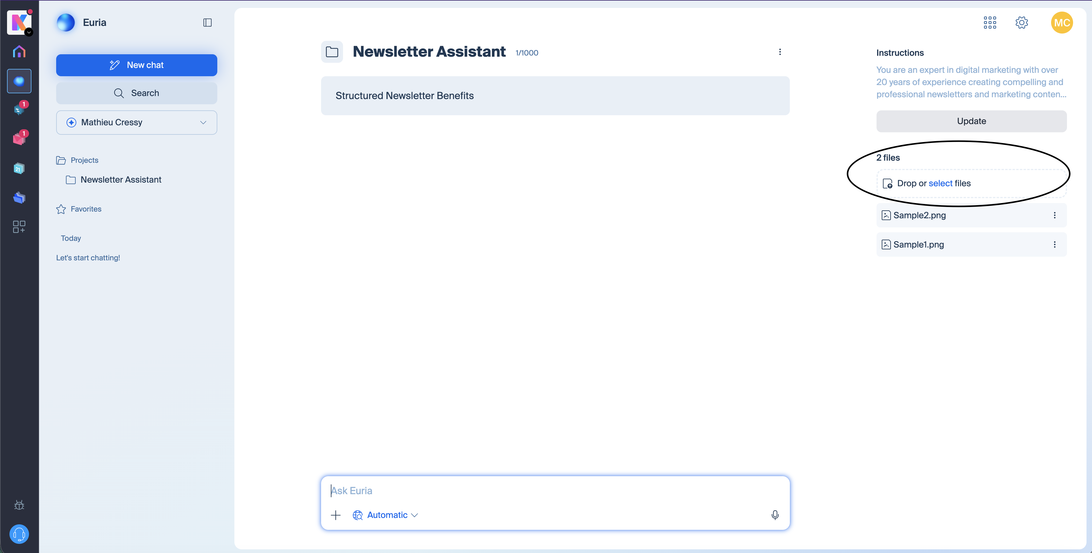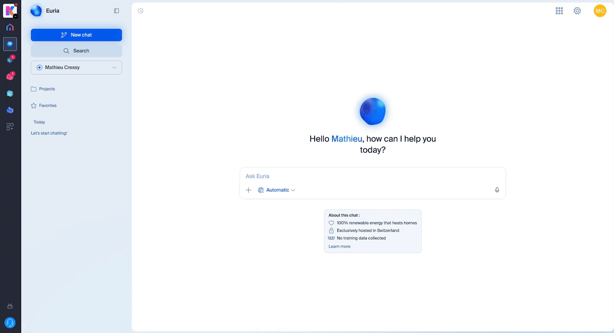 Senza un progetto, un assistente IA risponde in modo generale. Con un progetto Euria, gli date un contesto grazie a istruzioni personalizzate: il vostro tono preferito, informazioni sulla vostra azienda, i vostri file di riferimento… Risultato: risposte su misura, come se il vostro assistente IA conoscesse già il vostro universo. A differenza delle custom instructions di ChatGPT o delle project instructions di Claude, i vostri dati rimangono ospitati in Svizzera e non vengono mai utilizzati per addestrare modelli.