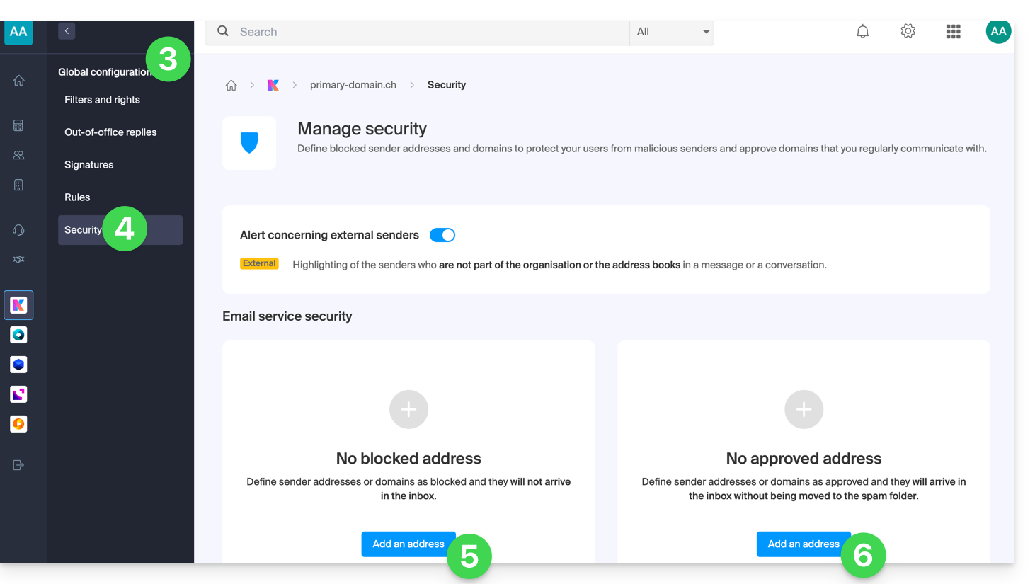 - Ottenere il permesso di gestire le regole: se sei stato invitato sull'app Web Mail Infomaniak (servizio online ksuite.infomaniak.com/mail) per gestire il tuo indirizzo, è possibile che il gestore del Servizio Mail ti abbia rimosso questo diritto dal suo account admin.