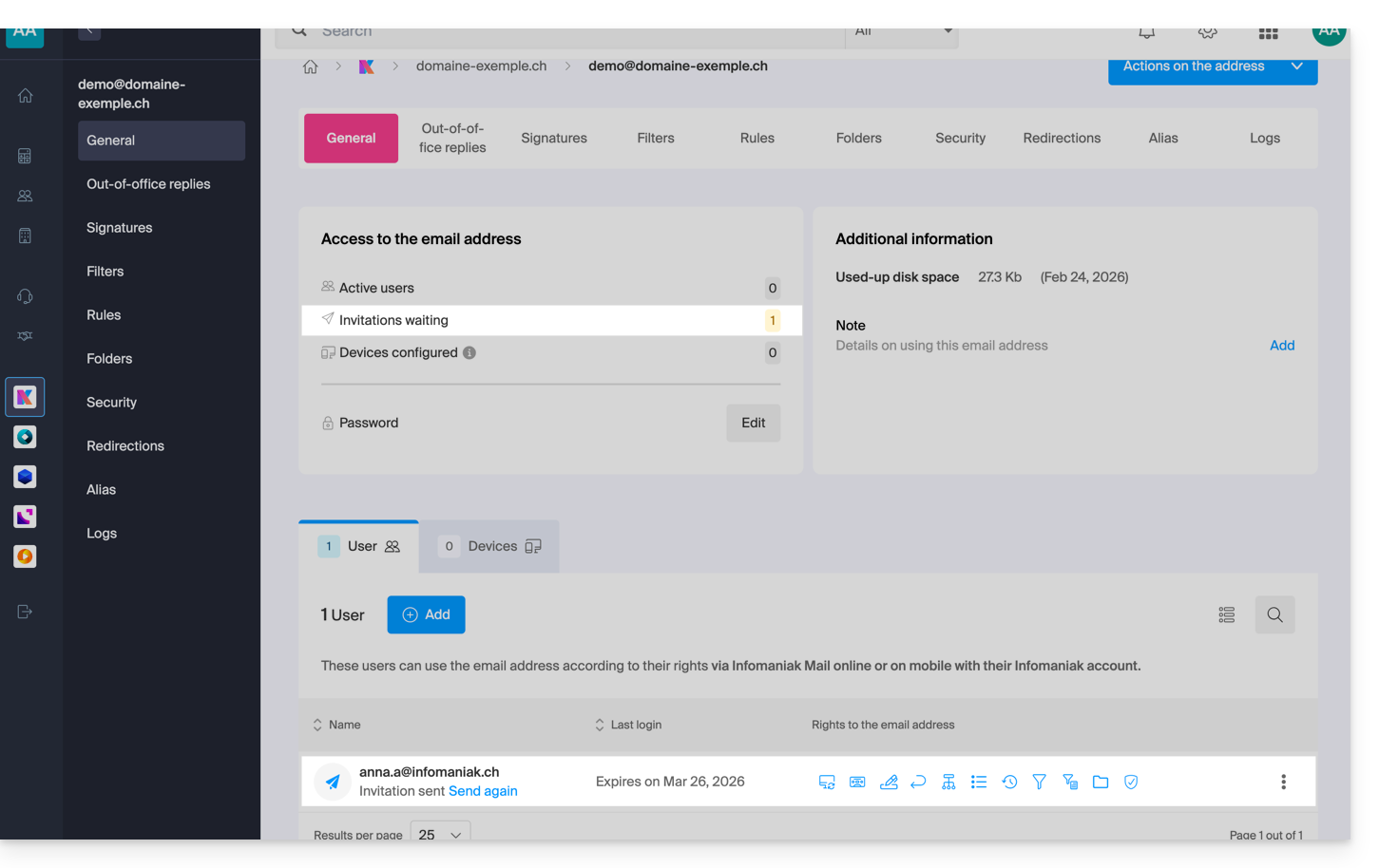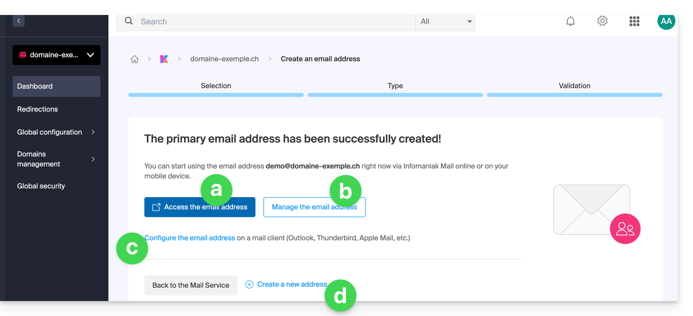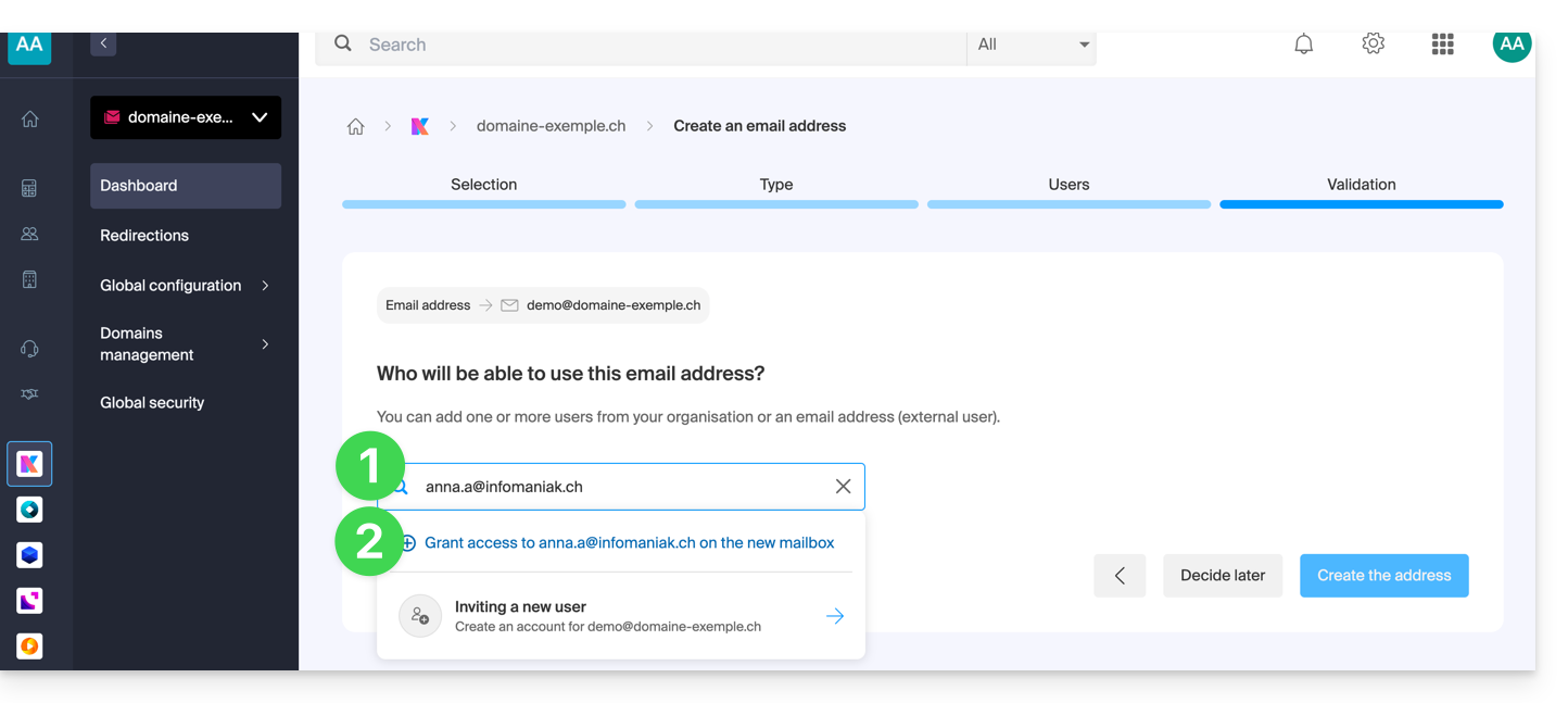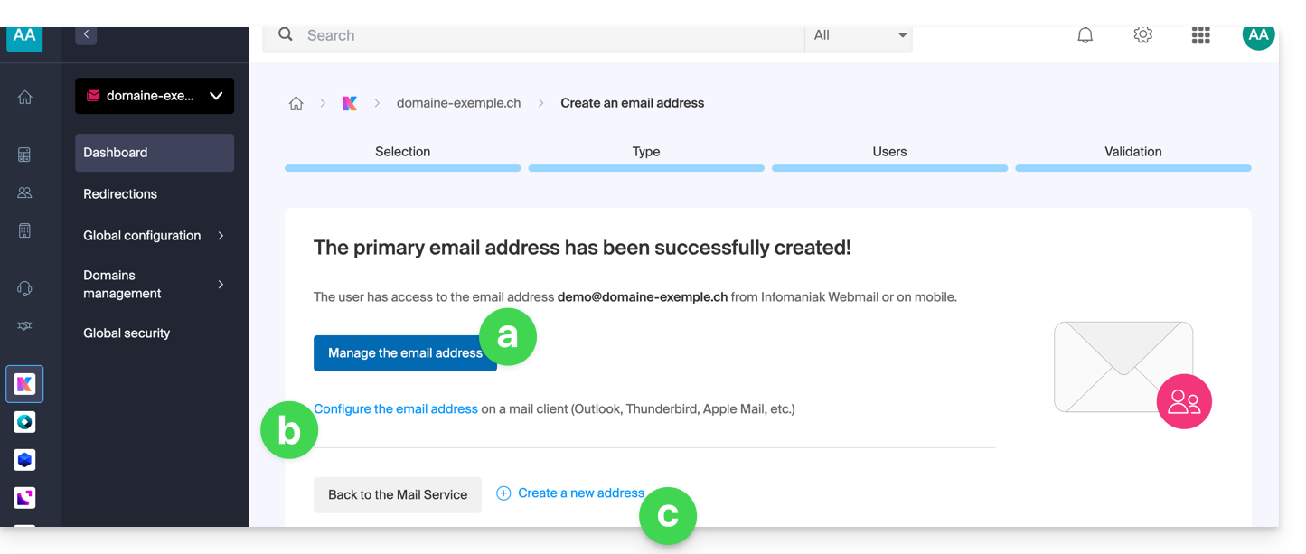 - È tutto pronto: l'indirizzo email è ora visibile nelle loro app Mail Infomaniak (ksuite.infomaniak.com/mail, app mobile, ecc.).
