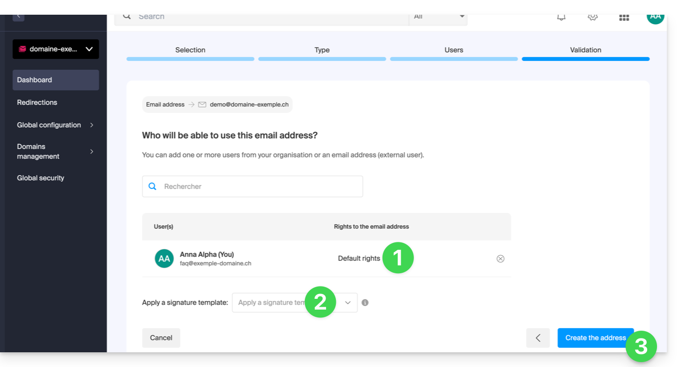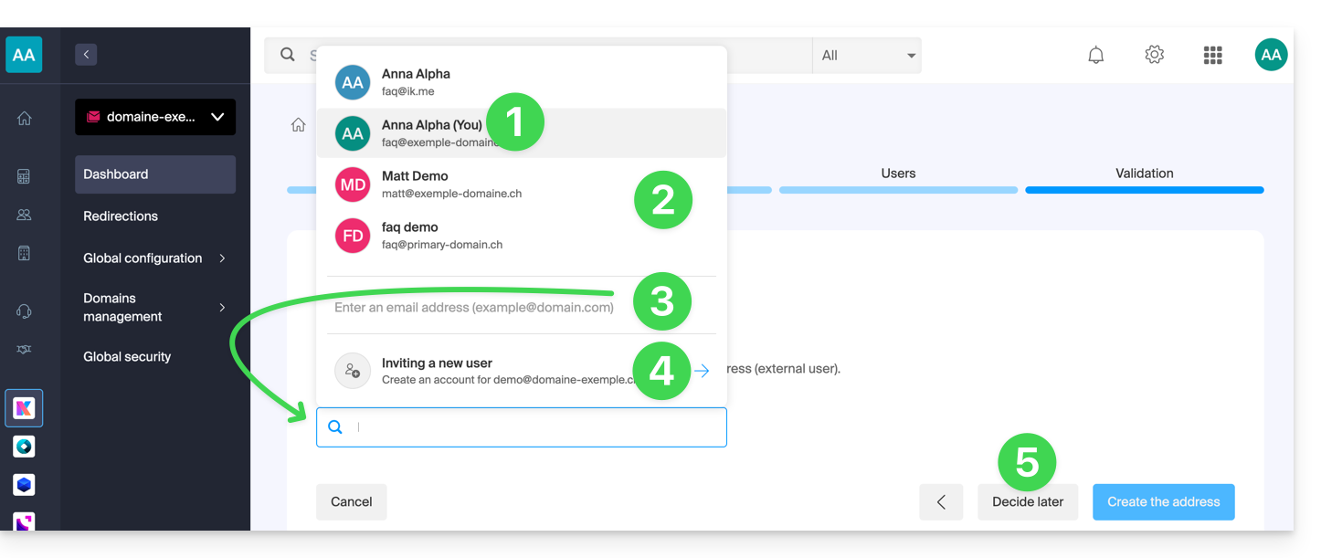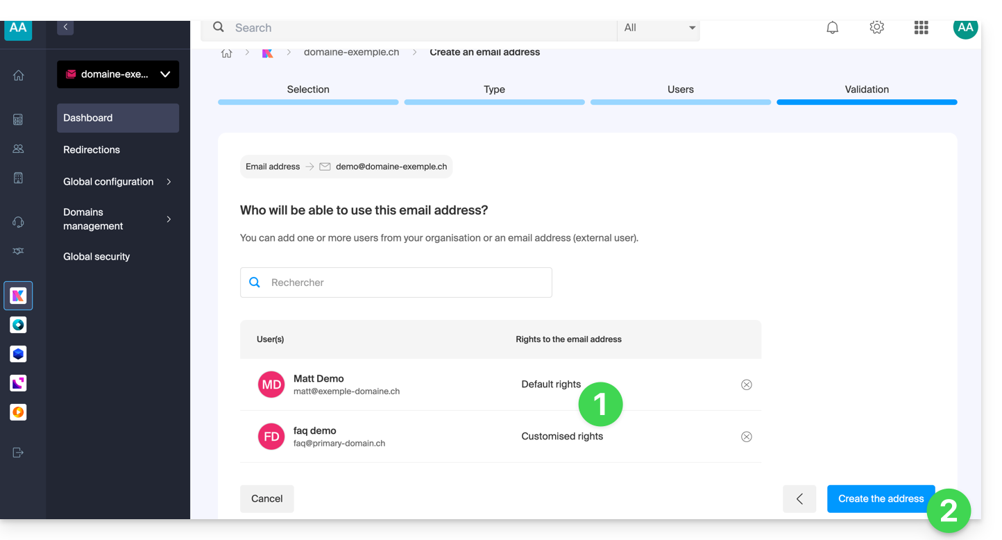 - È tutto pronto: l'indirizzo email è ora visibile nelle loro app Mail Infomaniak (ksuite.infomaniak.com/mail, app mobile, ecc.).