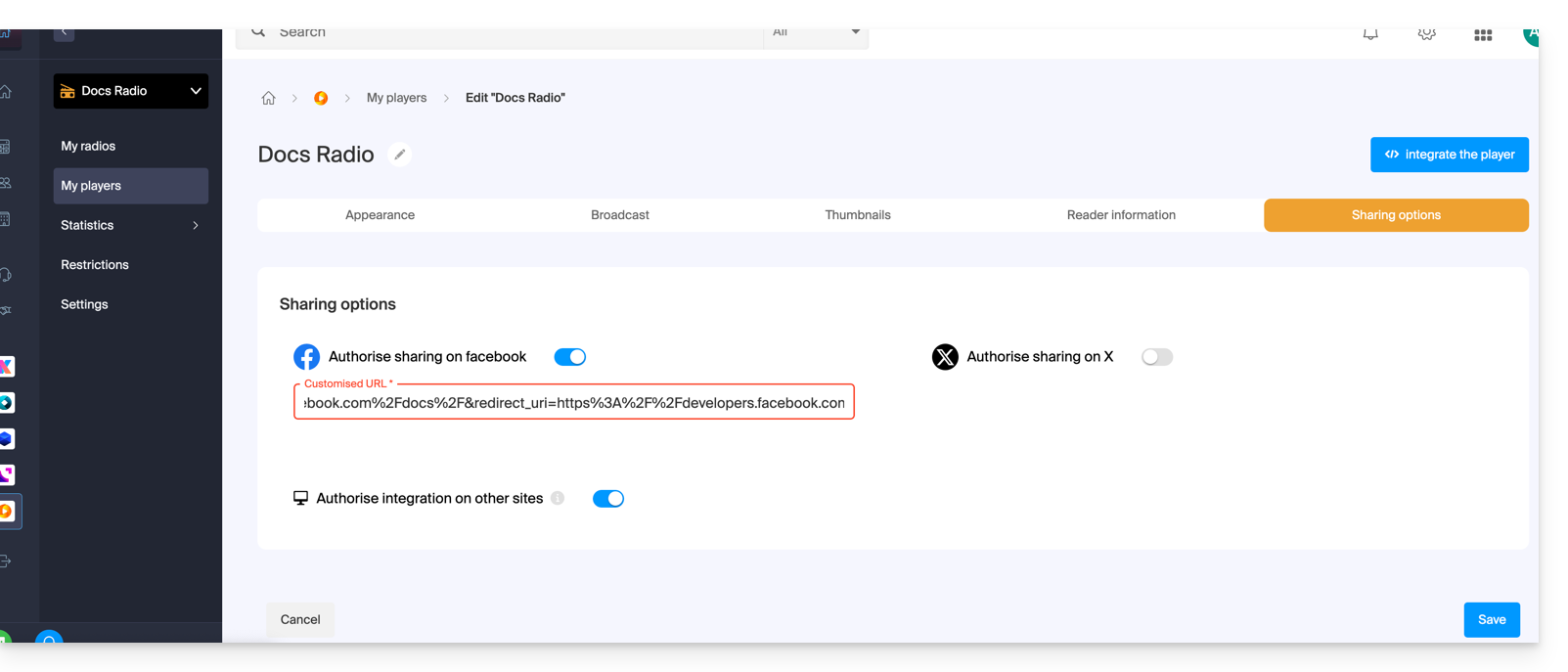 Una volta attivato, un pulsante di condivisione verso questi servizi sarà visibile sul Player: