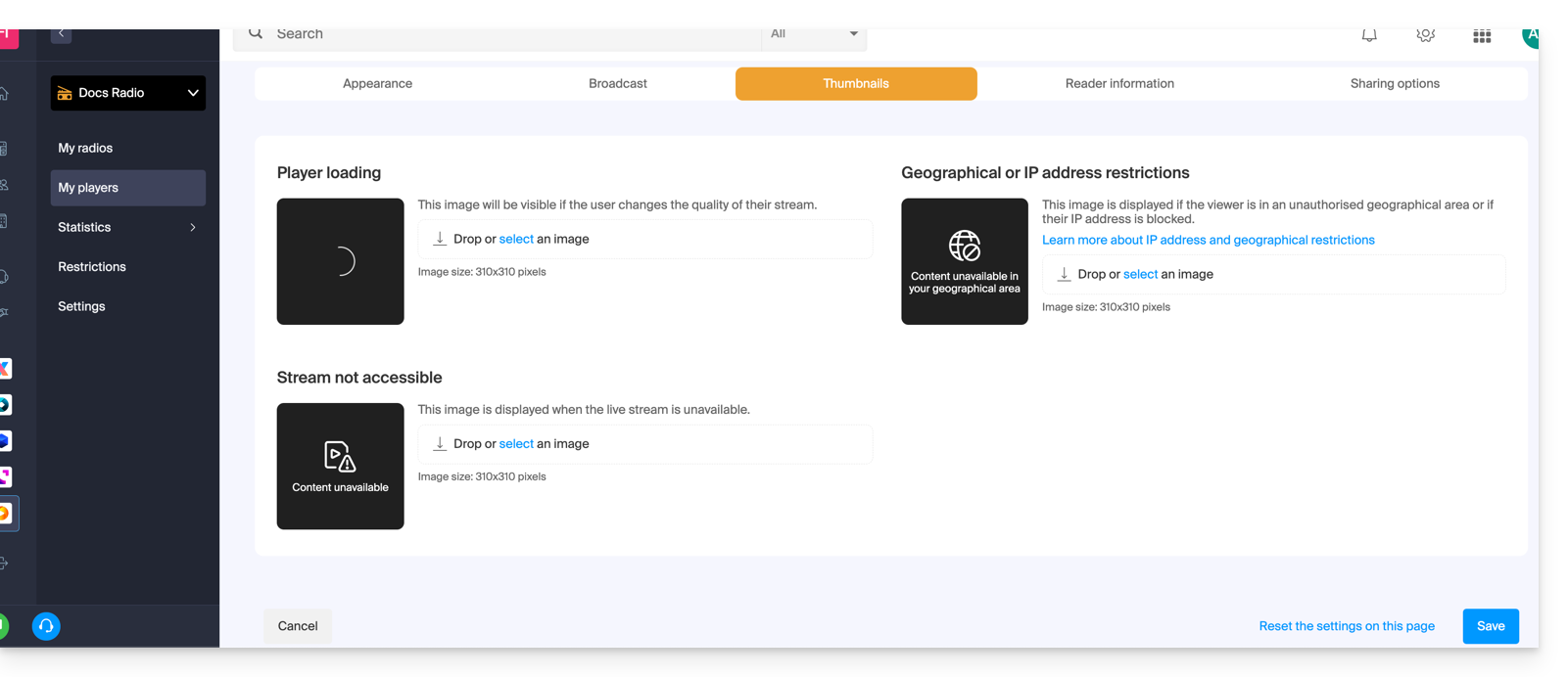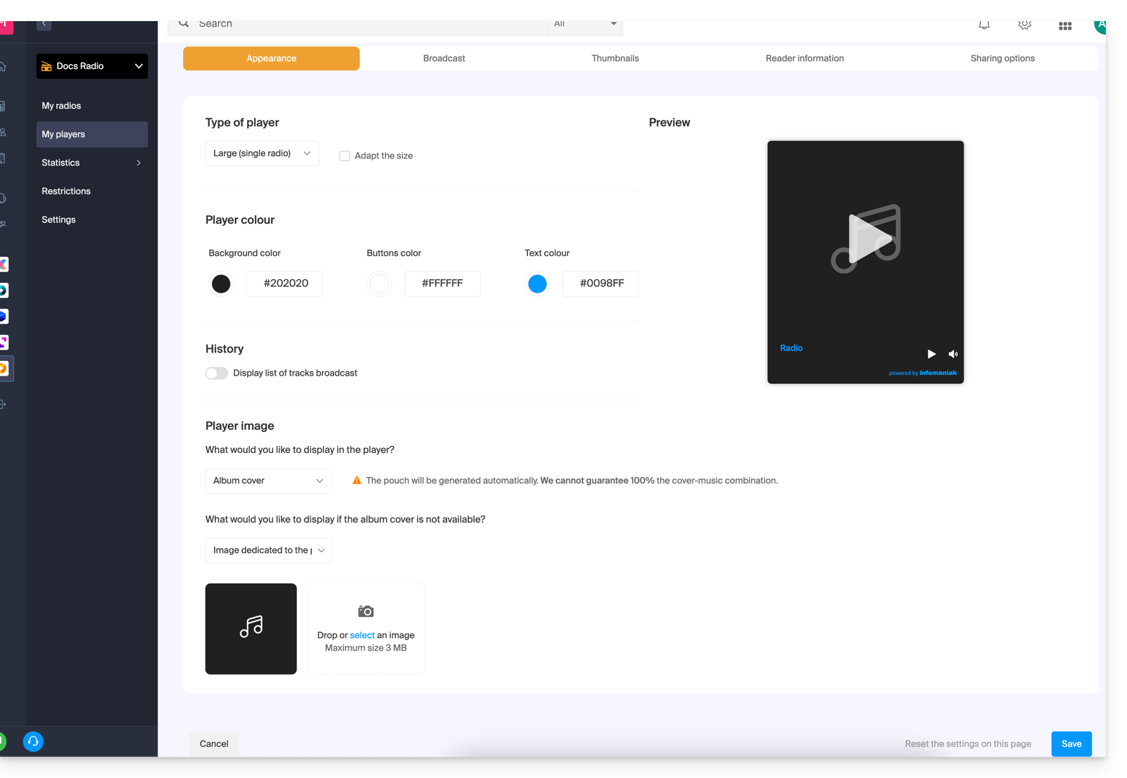 È qui che puoi scegliere la dimensione del lettore (grande, media, mini, o lettore multi radio) e la sua percentuale di visualizzazione.