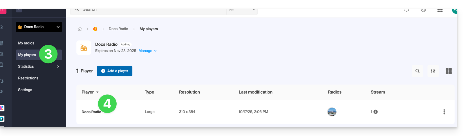 - Clicca sul nome del Player da configurare (o aggiungi un nuovo lettore cliccando sul pulsante sopra):