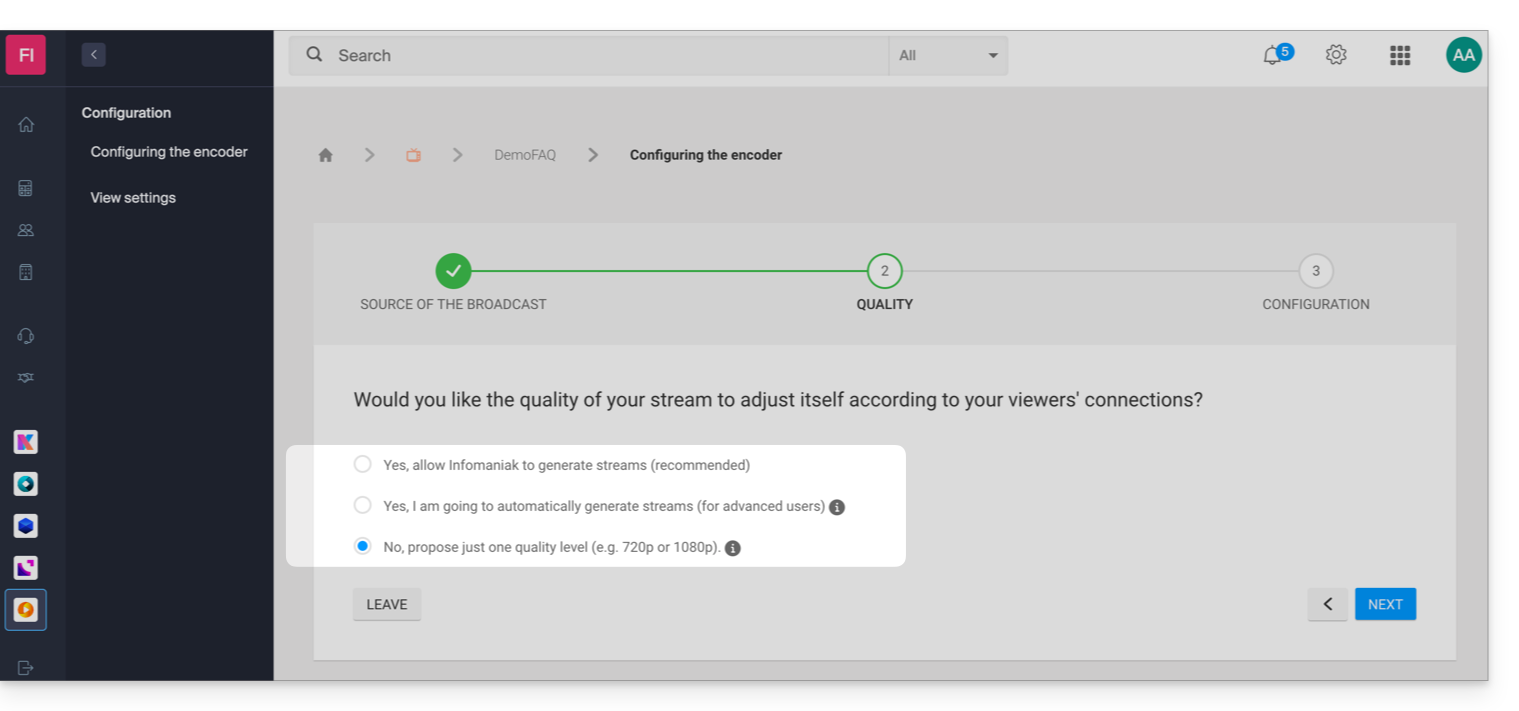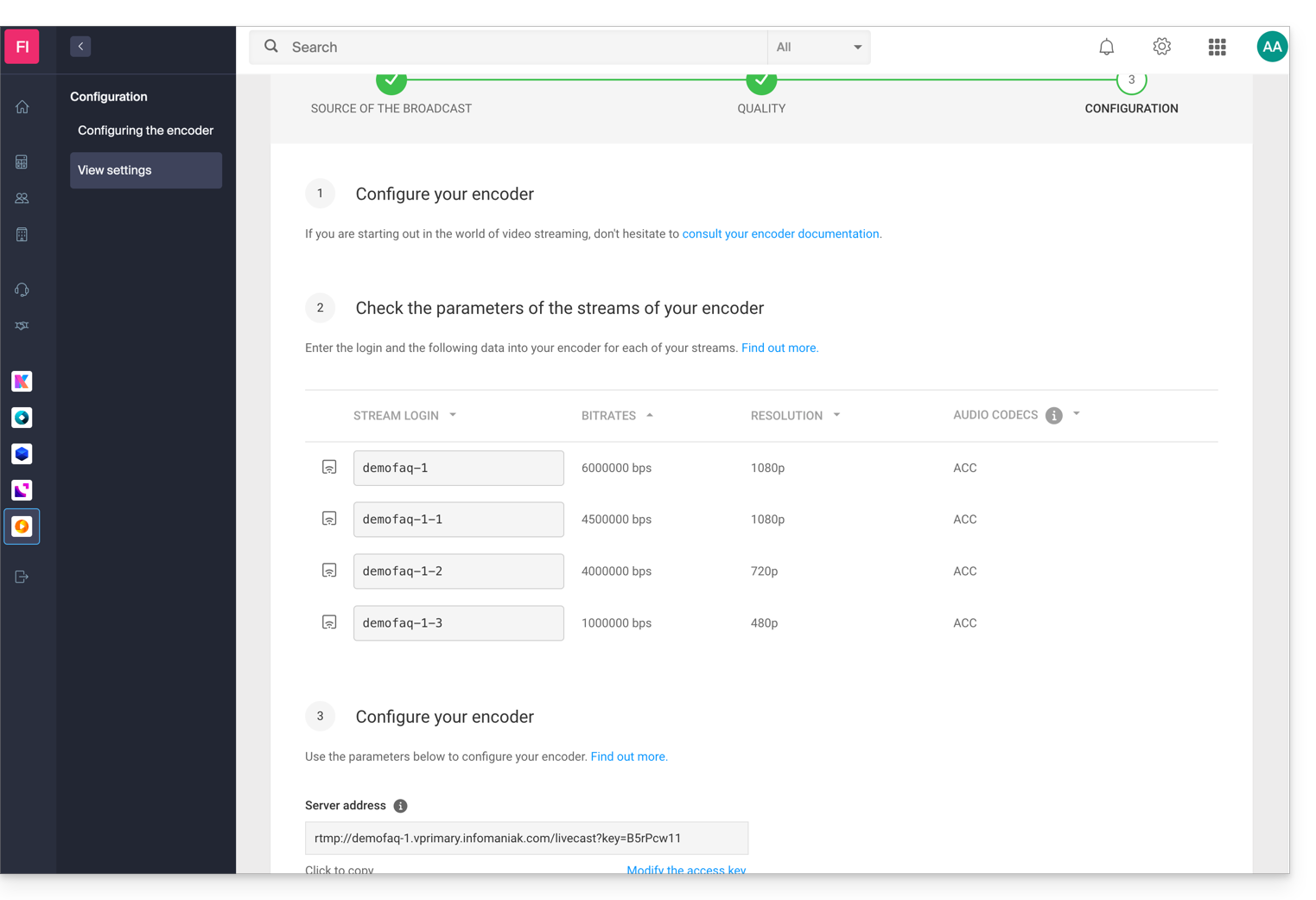 - … tramite un encoder video (o una telecamera che fa da encoder) che spingerà il flusso verso i server Infomaniak; per offrire diverse qualità di flusso e migliorare l'esperienza dei vostri utenti, avete la possibilità di attivare il multi-bitrate