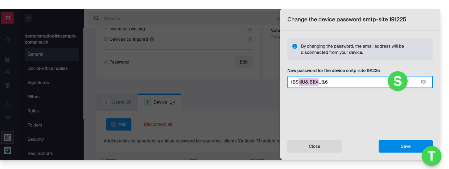 Per aggiungere una password all'indirizzo di esempio demonstration@exemple-domaine.ch: