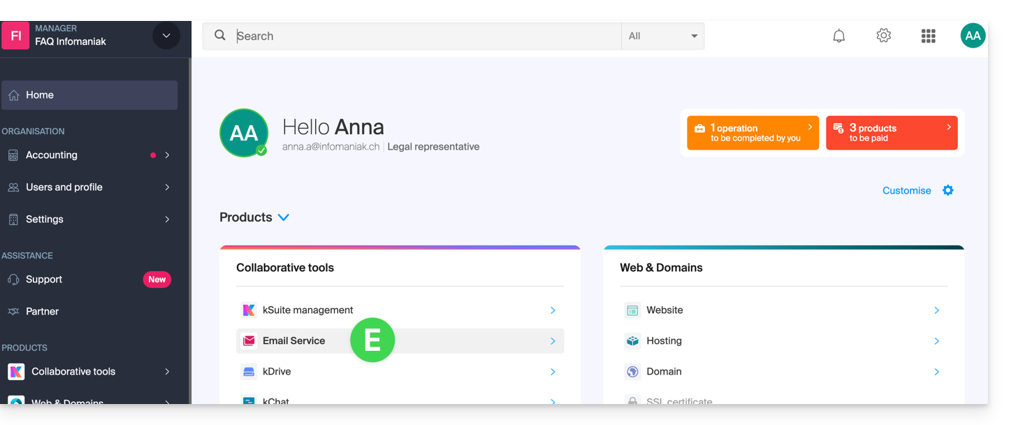 Al contrario, se l'indirizzo email utilizzato come identificativo è ospitato da Infomaniak (ad esempio anna789@assoziation.ch) e un amministratore elimina l'indirizzo email in questione o annulla il Servizio Mail “assoziation.ch”, la situazione è diversa: ricevi automaticamente un'e-mail sull'indirizzo secondario e un SMS sul numero di telefono cellulare specificato nel tuo account Infomaniak: