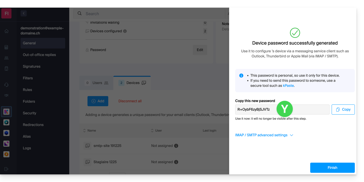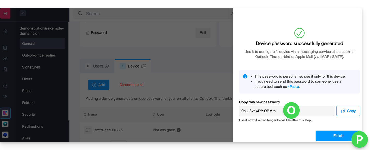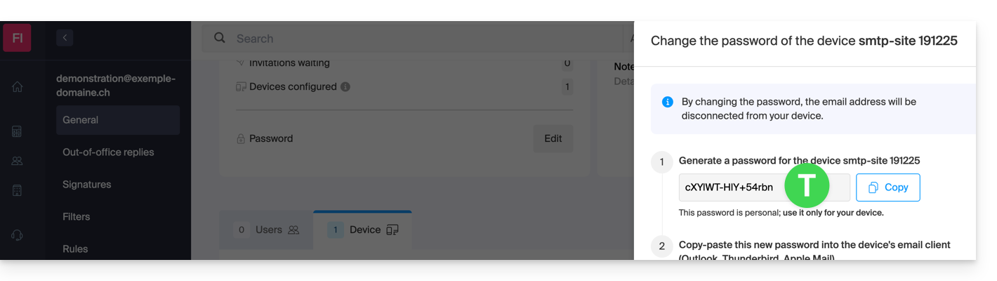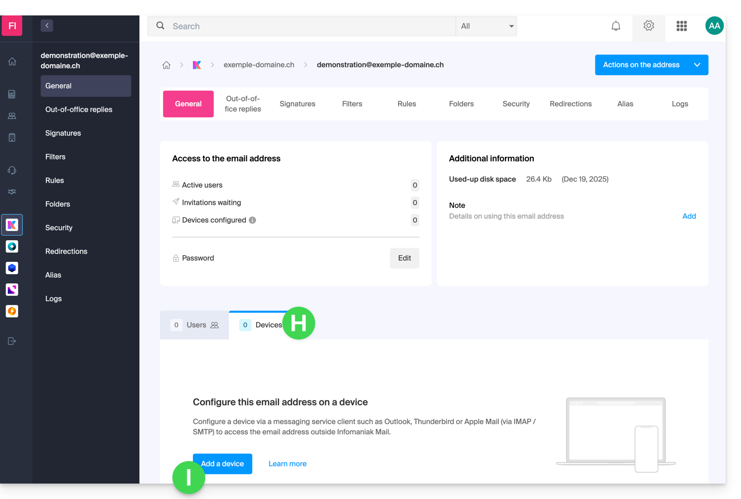 - ottenere una password affinché un utente terzo possa aggiungere l'indirizzo all'interno della propria app Web Mail Infomaniak